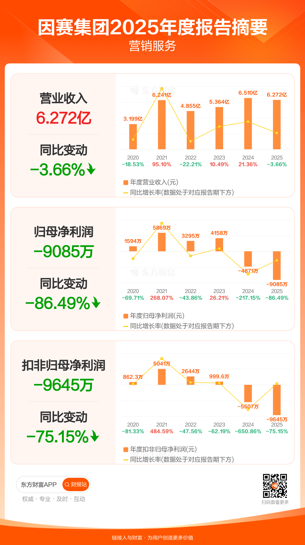 因赛集团4月29日发布2025年年报显示,公司全年实现营业收入6.27亿元,同比下滑3.66%;归母净利润-9084.84万元;扣非归母净利润-9644.62万元。