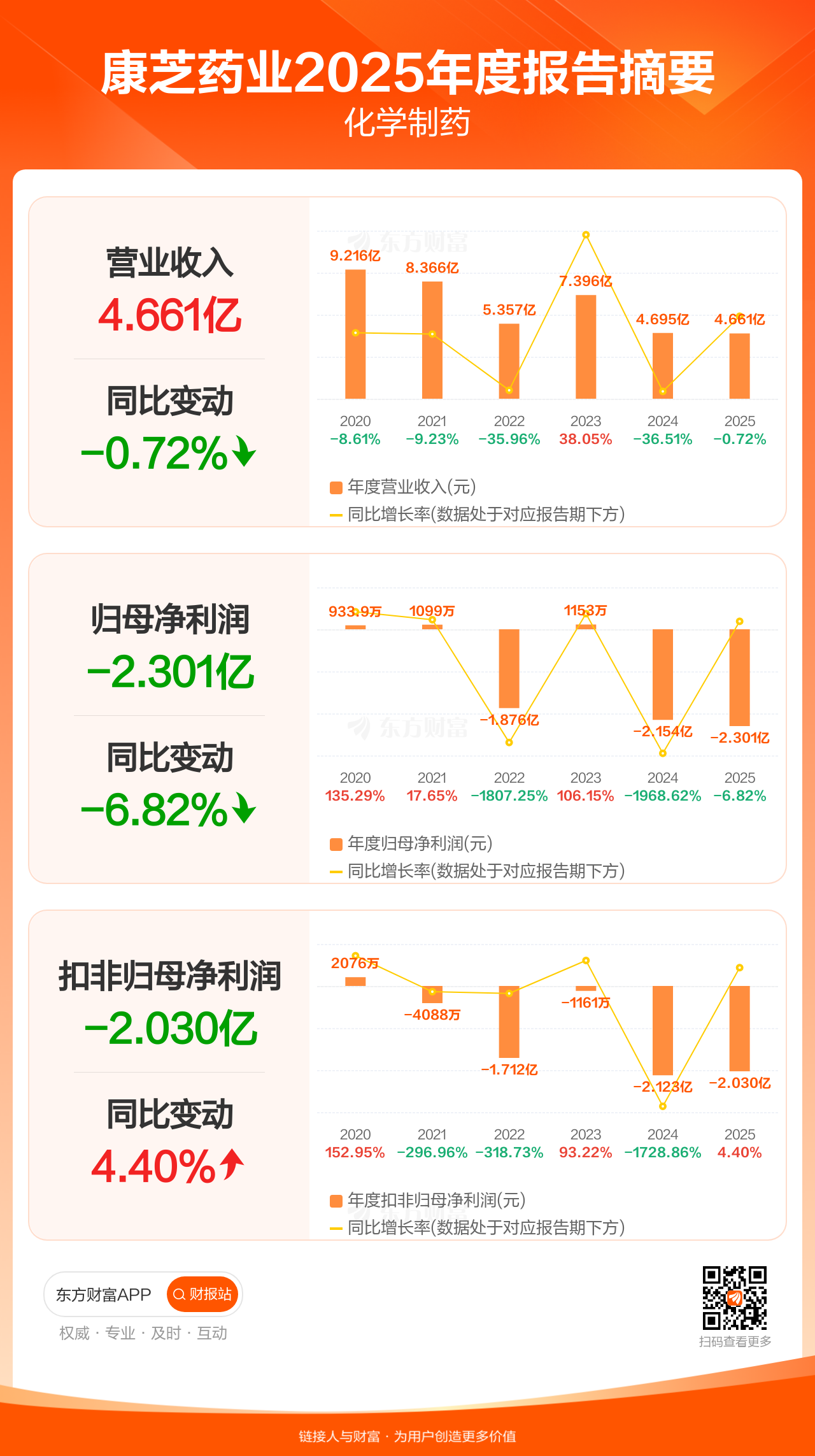 康芝药业4月29日发布2025年年报显示,公司全年实现营业收入4.66亿元,同比下滑0.72%;归母净利润-2.30亿元;扣非归母净利润-2.03亿元。