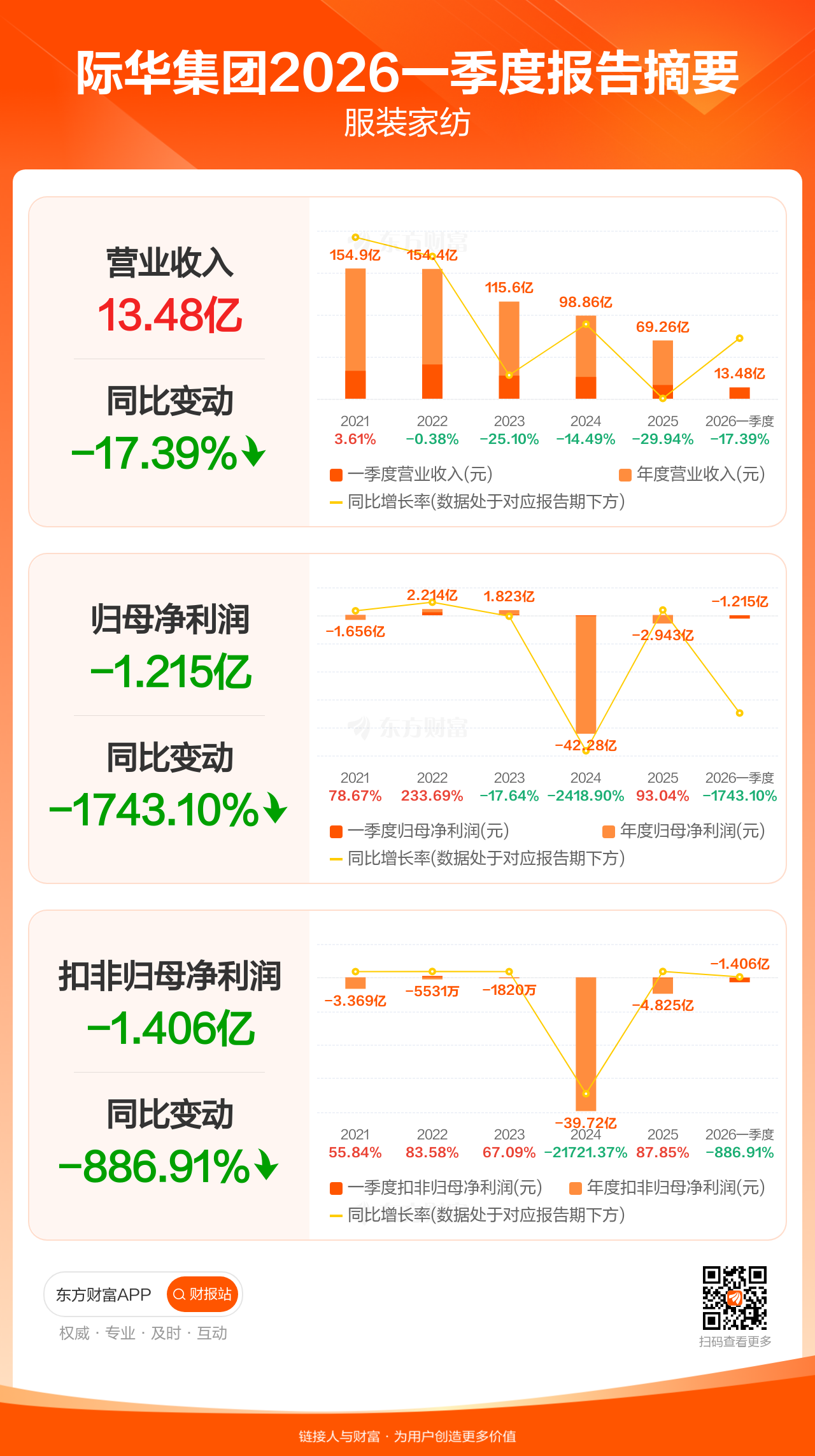 际华集团4月29日发布2026年一季报显示,公司一季度实现营业收入13.48亿元,同比下滑17.39%;归母净利润-1.22亿元;扣非归母净利润-1.41亿元。