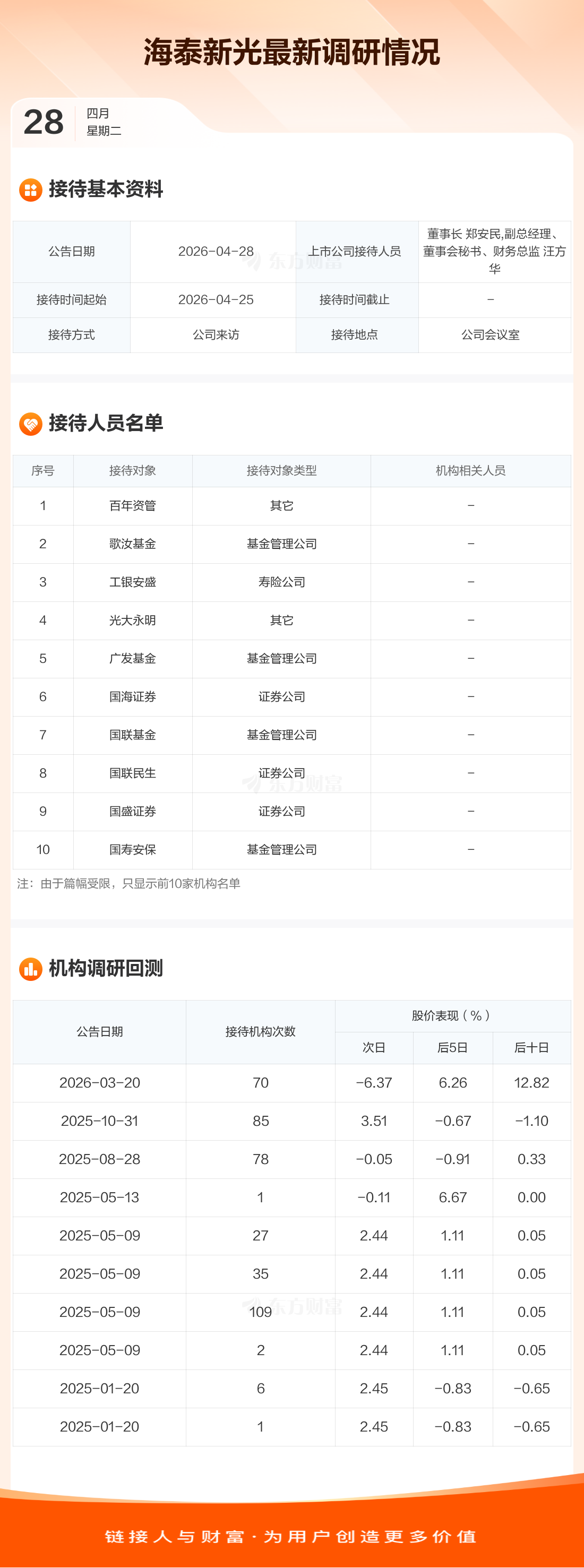 海泰新光4月28日公告称,4月25日接待百年资管等77家机构调研。接待人员包括董事长 郑安民,副总经理、董事会秘书、财务总监 汪方华。