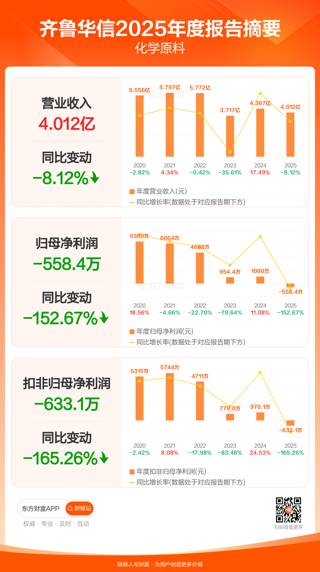 齐鲁华信4月28日发布2025年年报显示,公司全年实现营业收入4.01亿元,同比下滑8.12%;归母净利润-558.38万元;扣非归母净利润-633.11万元。