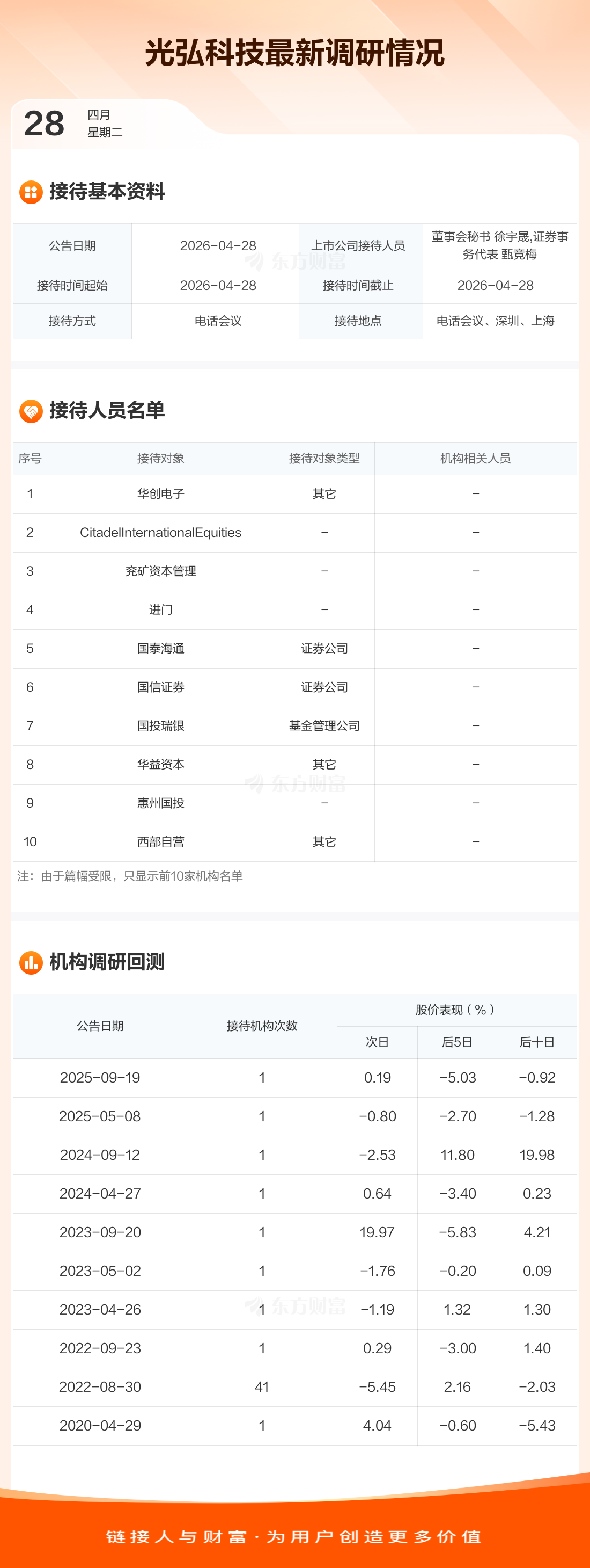 光弘科技4月28日公告称,4月28日接待华创电子等19家机构调研。接待人员包括董事会秘书 徐宇晟,证券事务代表 甄竞梅。