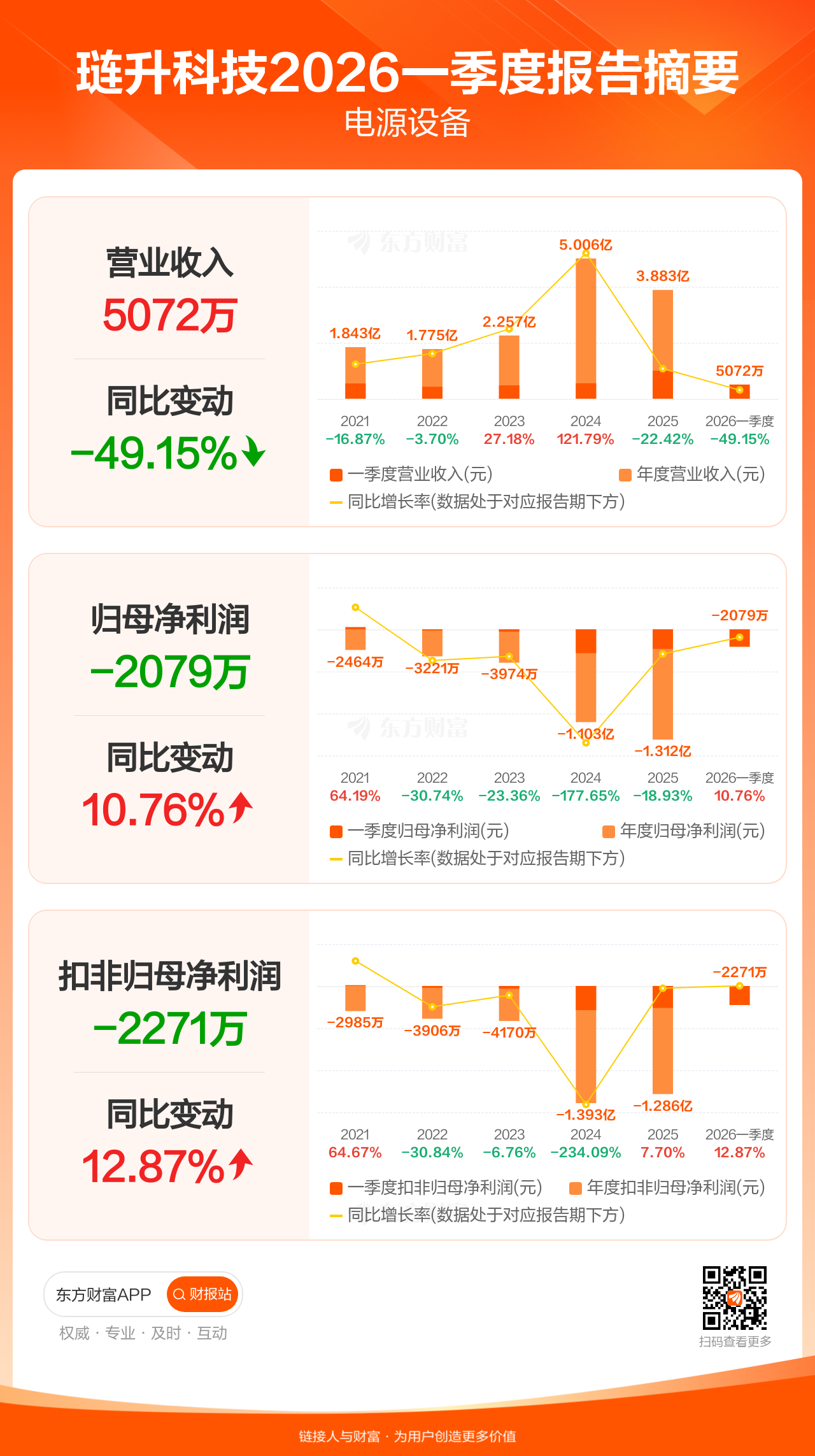 琏升科技4月29日发布2026年一季报显示,公司一季度实现营业收入5071.66万元,同比下滑49.15%;归母净利润-2078.92万元;扣非归母净利润-2271.00万元。