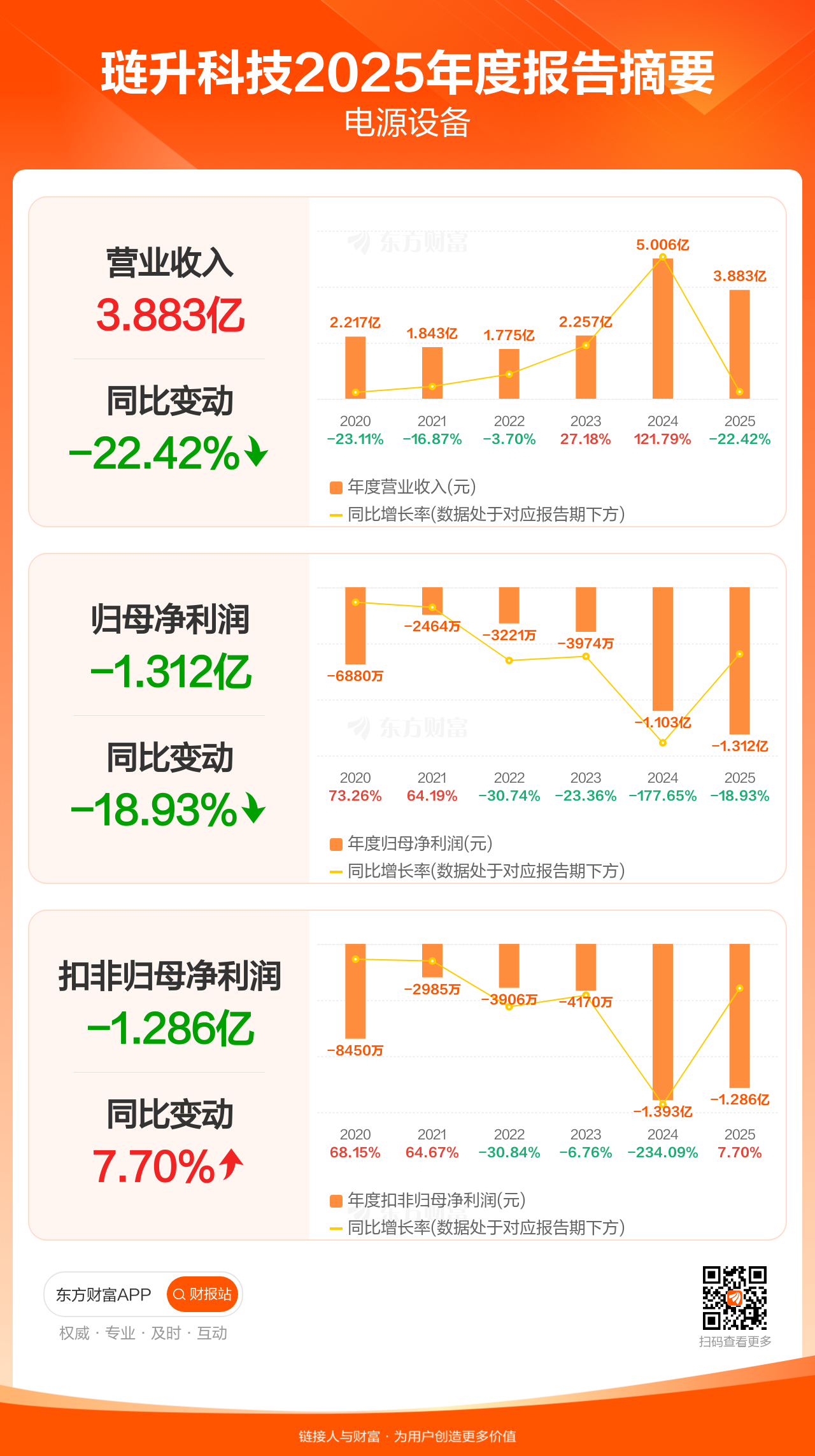 琏升科技4月29日发布2025年年报显示,公司全年实现营业收入3.88亿元,同比下滑22.42%;归母净利润-1.31亿元;扣非归母净利润-1.29亿元。