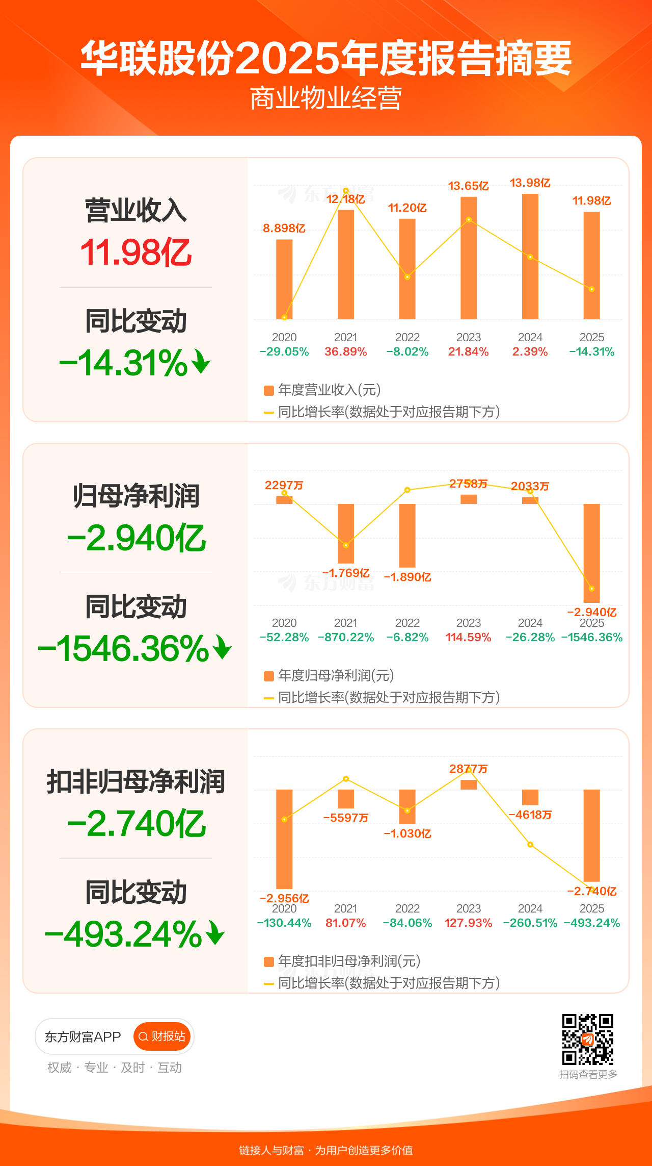 华联股份4月29日发布2025年年报显示,公司全年实现营业收入11.98亿元,同比下滑14.31%;归母净利润-2.94亿元;扣非归母净利润-2.74亿元。