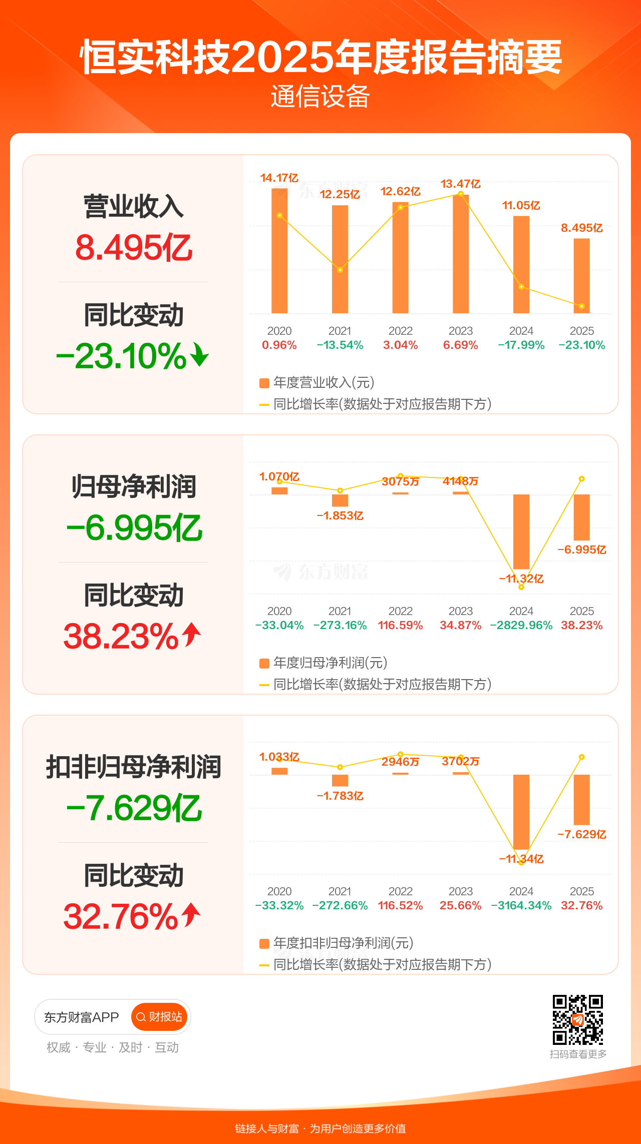 恒实科技4月29日发布2025年年报显示,公司全年实现营业收入8.49亿元,同比下滑23.10%;归母净利润-6.99亿元;扣非归母净利润-7.63亿元。
