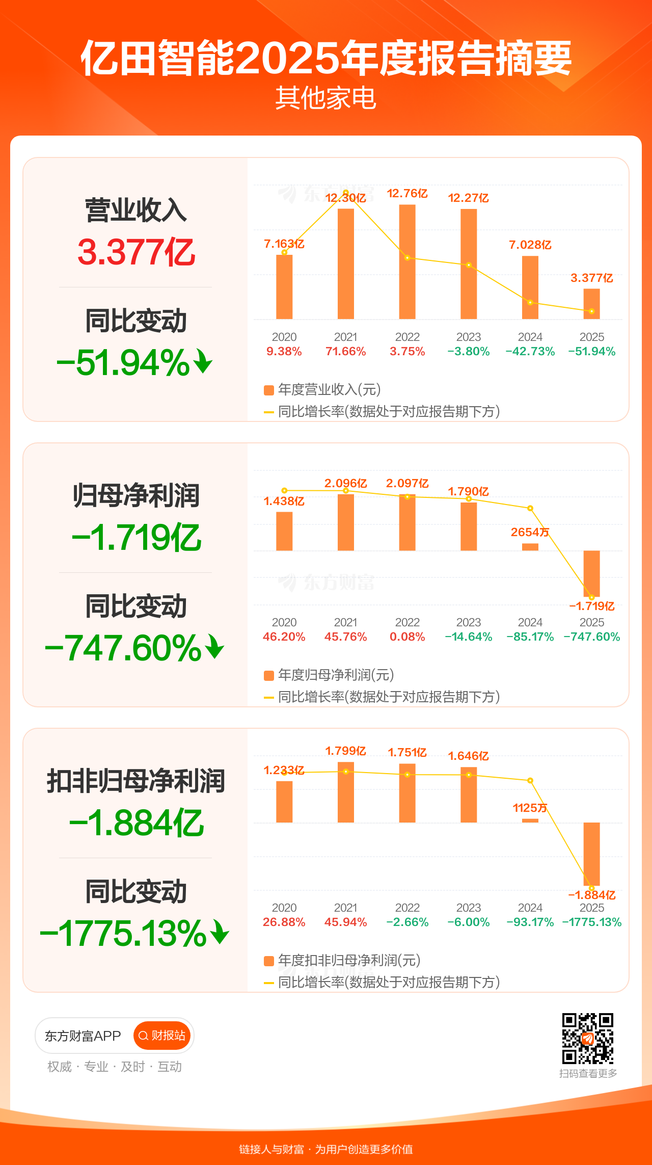 亿田智能4月29日发布2025年年报显示,公司全年实现营业收入3.38亿元,同比下滑51.94%;归母净利润-1.72亿元;扣非归母净利润-1.88亿元。