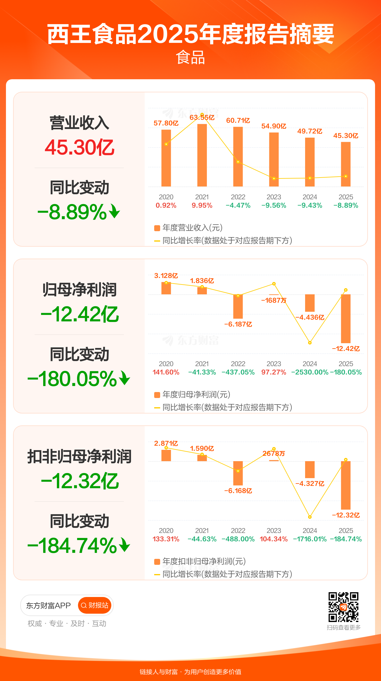 西王食品4月29日发布2025年年报显示,公司全年实现营业收入45.30亿元,同比下滑8.89%;归母净利润-12.42亿元;扣非归母净利润-12.32亿元。