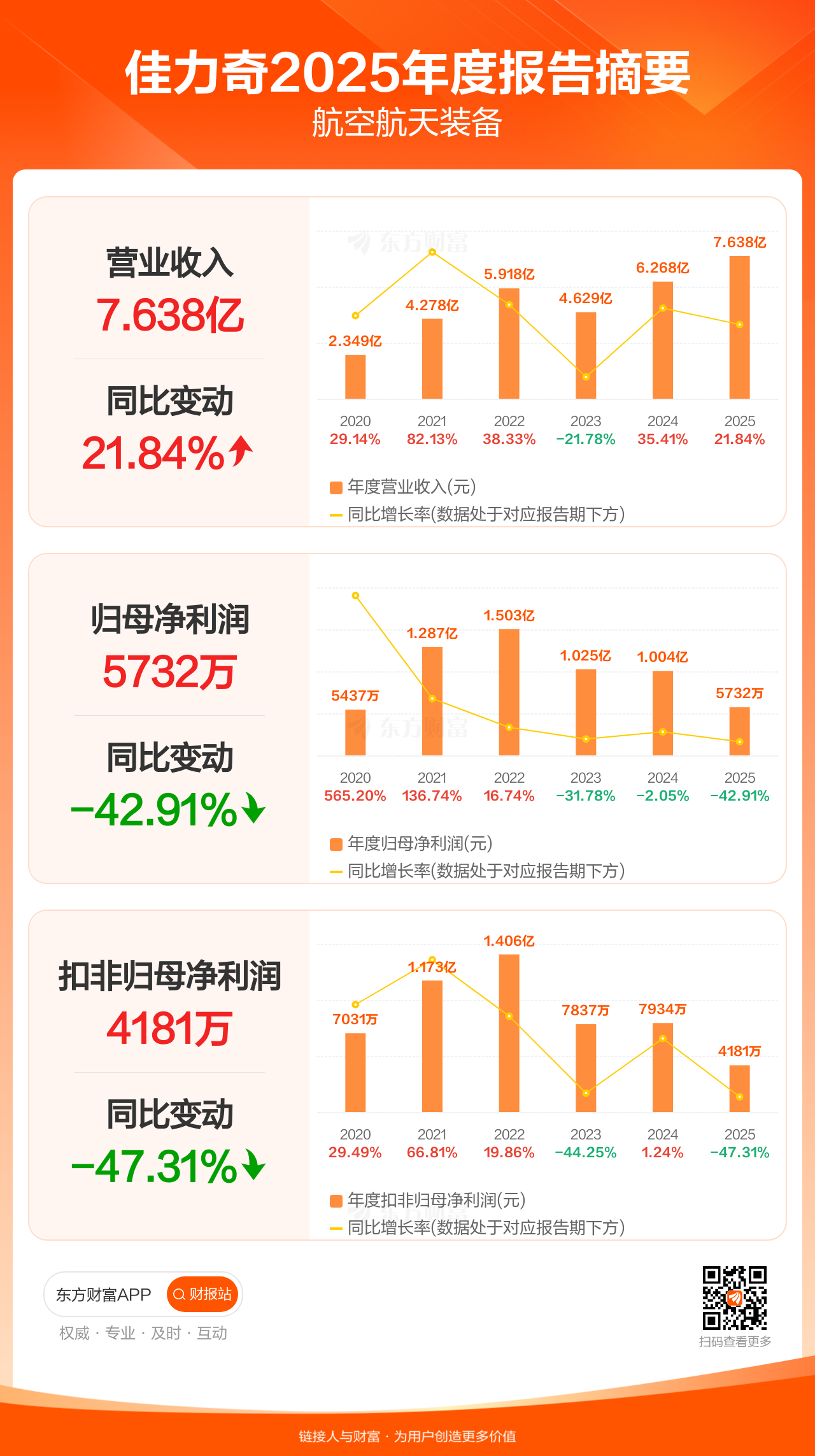佳力奇4月29日发布2025年年报显示,公司全年实现营业收入7.64亿元,同比增长21.84%;归母净利润5732.17万元,同比下滑42.91%;扣非归母净利润4180.78万元,同比下滑47.31%。