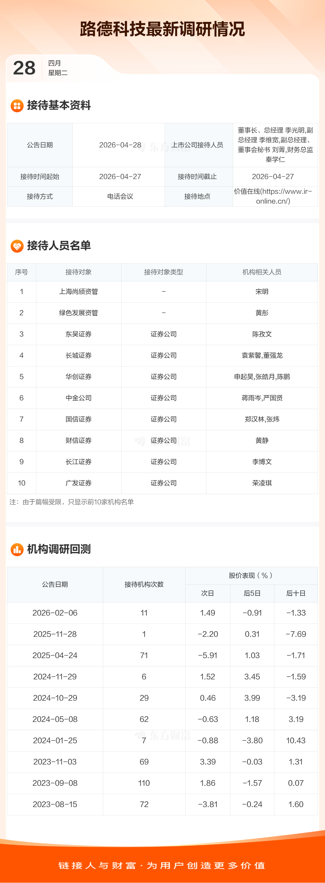路德科技4月28日公告称,4月27日接待上海尚颀资管等29家机构调研。接待人员包括董事长、总经理 季光明,副总经理 季维宽,副总经理、董事会秘书 刘菁,财务总监 秦学仁。