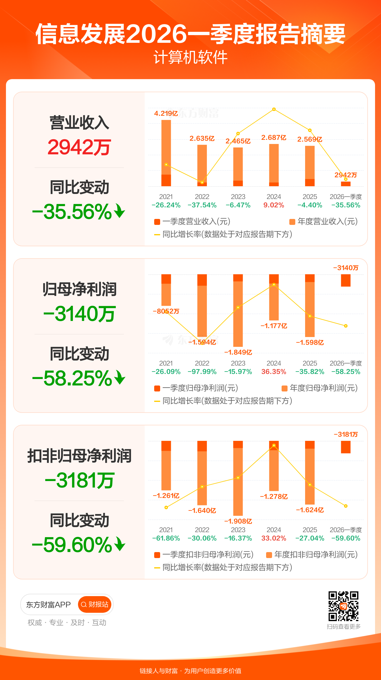 信息发展4月29日发布2026年一季报显示,公司一季度实现营业收入2942.23万元,同比下滑35.56%;归母净利润-3139.62万元;扣非归母净利润-3180.68万元。