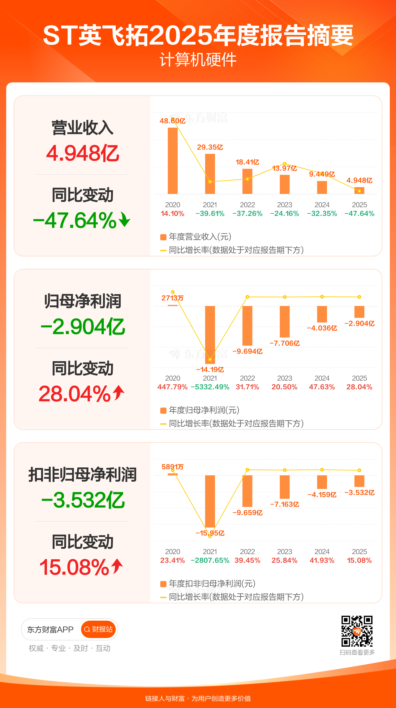 ST英飞拓4月29日发布2025年年报显示,公司全年实现营业收入4.95亿元,同比下滑47.64%;归母净利润-2.90亿元;扣非归母净利润-3.53亿元。