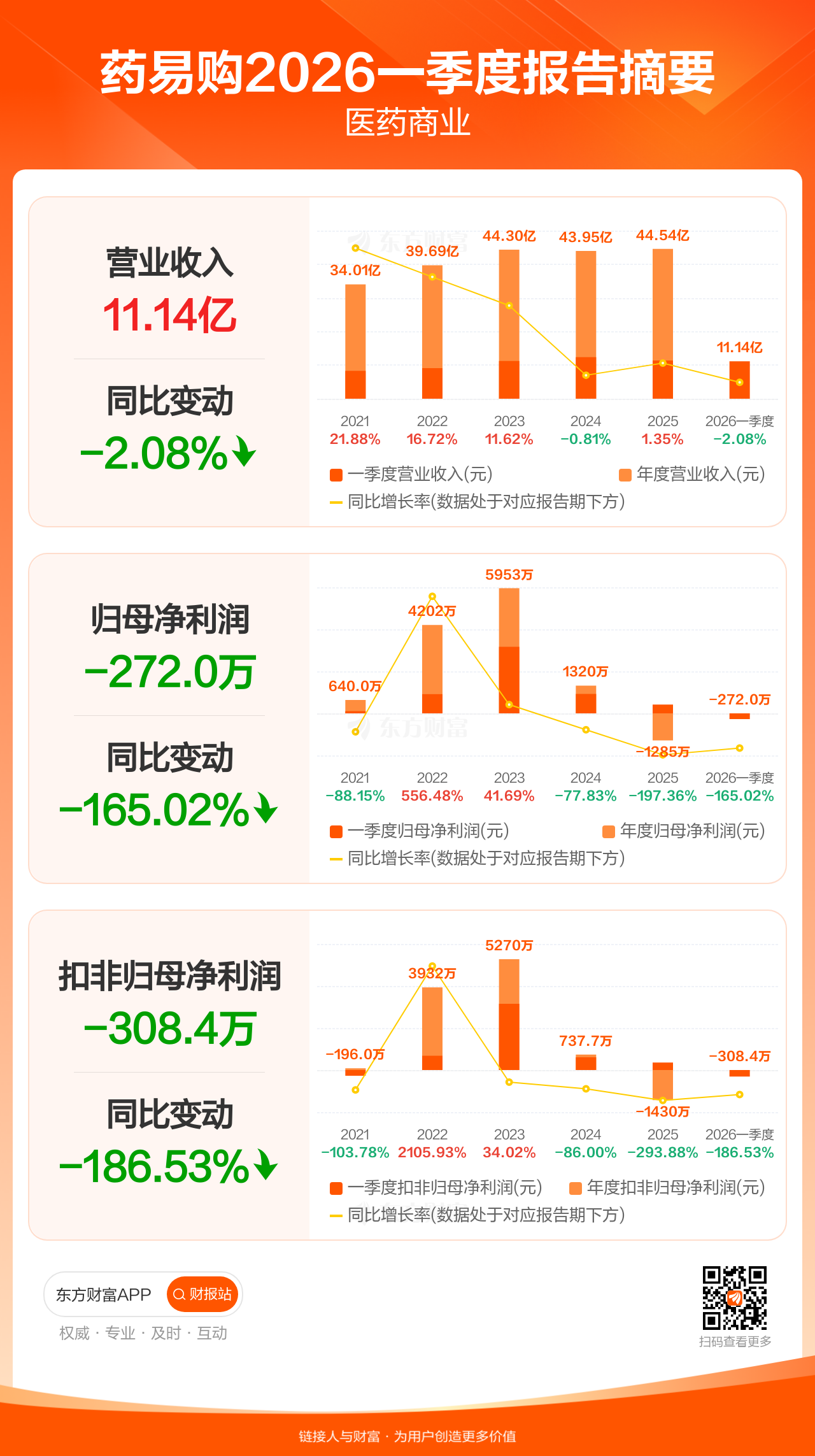 药易购4月29日发布2026年一季报显示,公司一季度实现营业收入11.14亿元,同比下滑2.08%;归母净利润-272.02万元;扣非归母净利润-308.41万元。