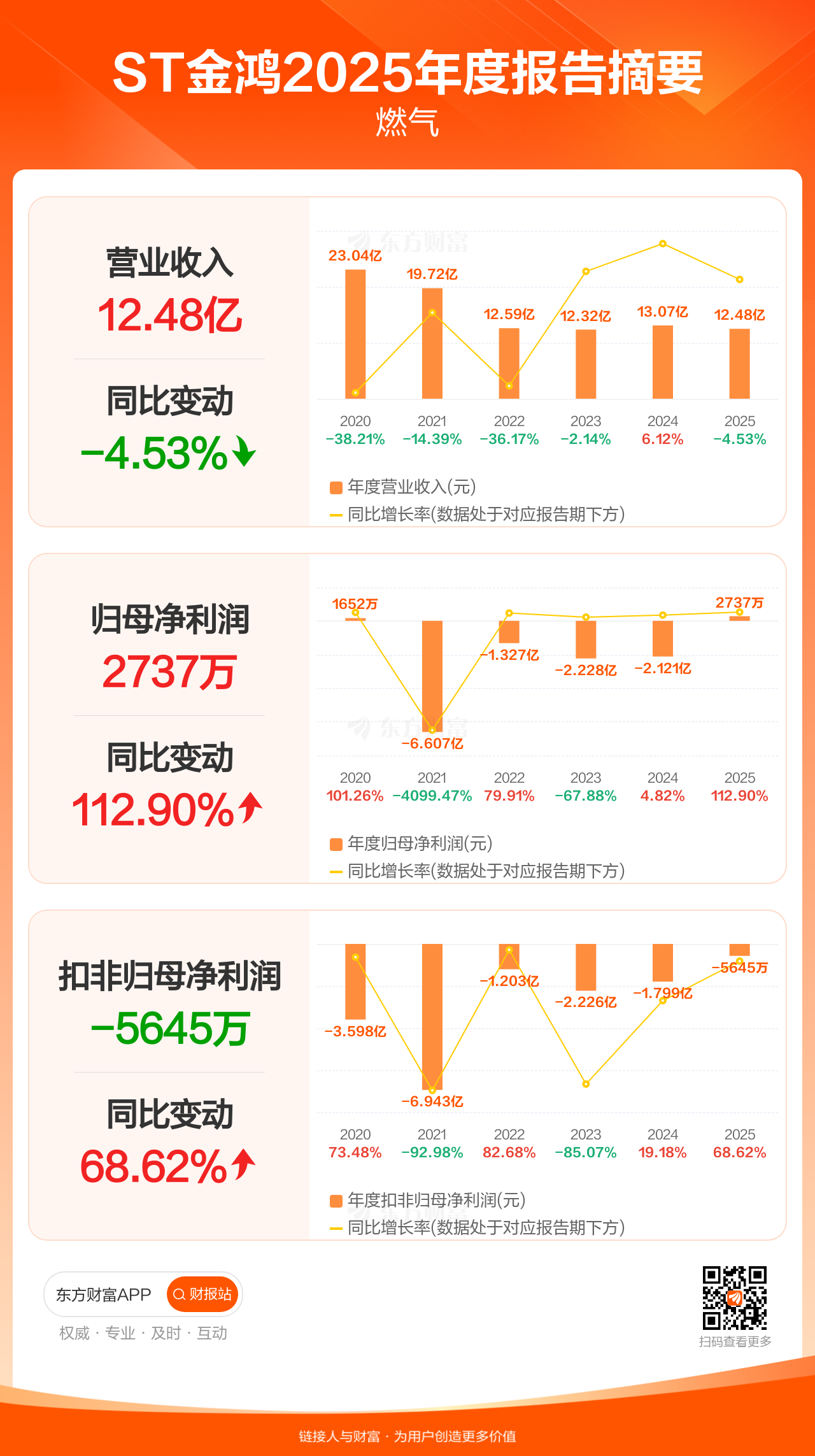 ST金鸿4月29日发布2025年年报显示,公司全年实现营业收入12.48亿元,同比下滑4.53%;归母净利润2736.58万元,同比增长112.90%;扣非归母净利润-5644.79万元。