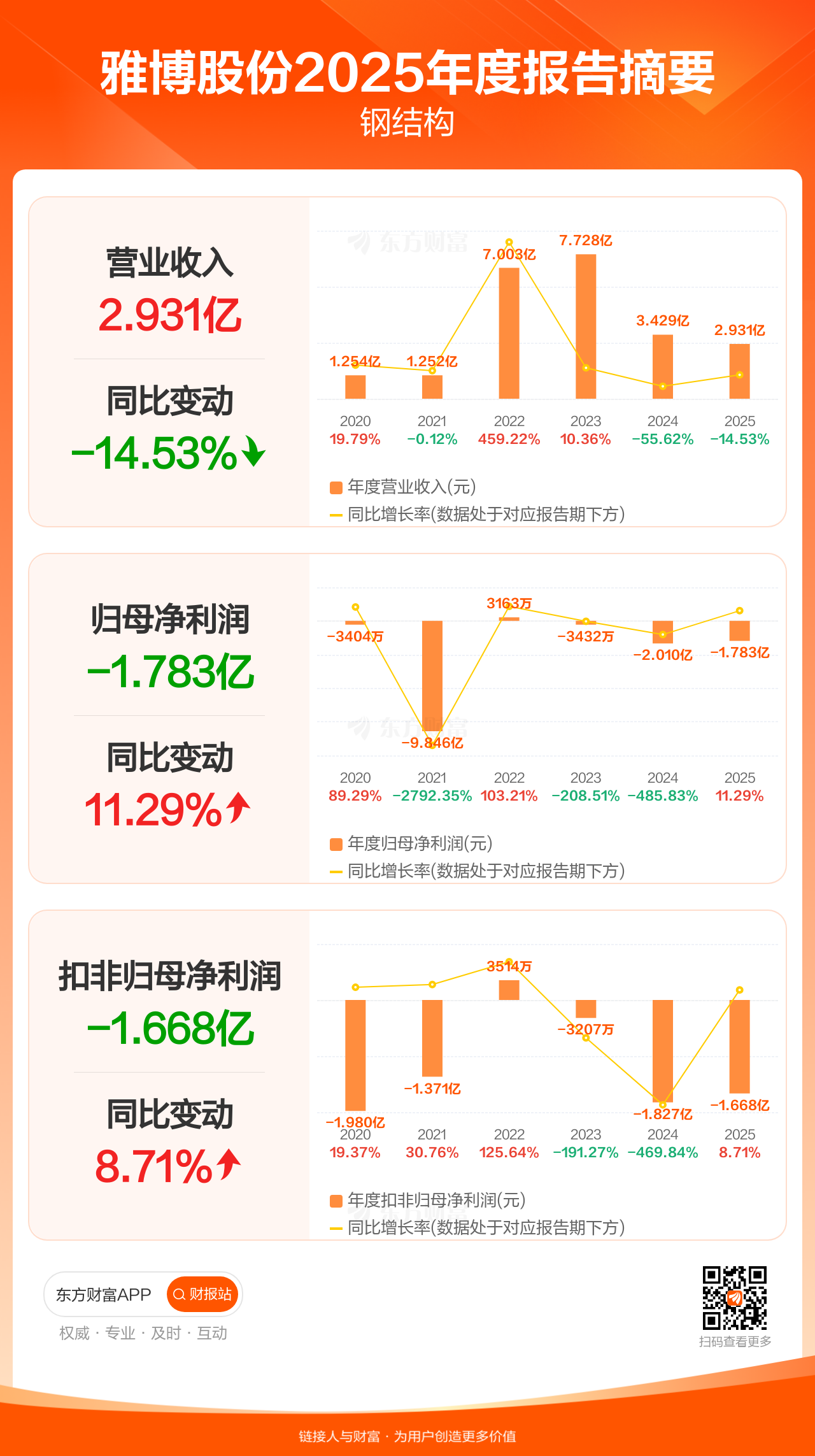 雅博股份4月29日发布2025年年报显示,公司全年实现营业收入2.93亿元,同比下滑14.53%;归母净利润-1.78亿元;扣非归母净利润-1.67亿元。