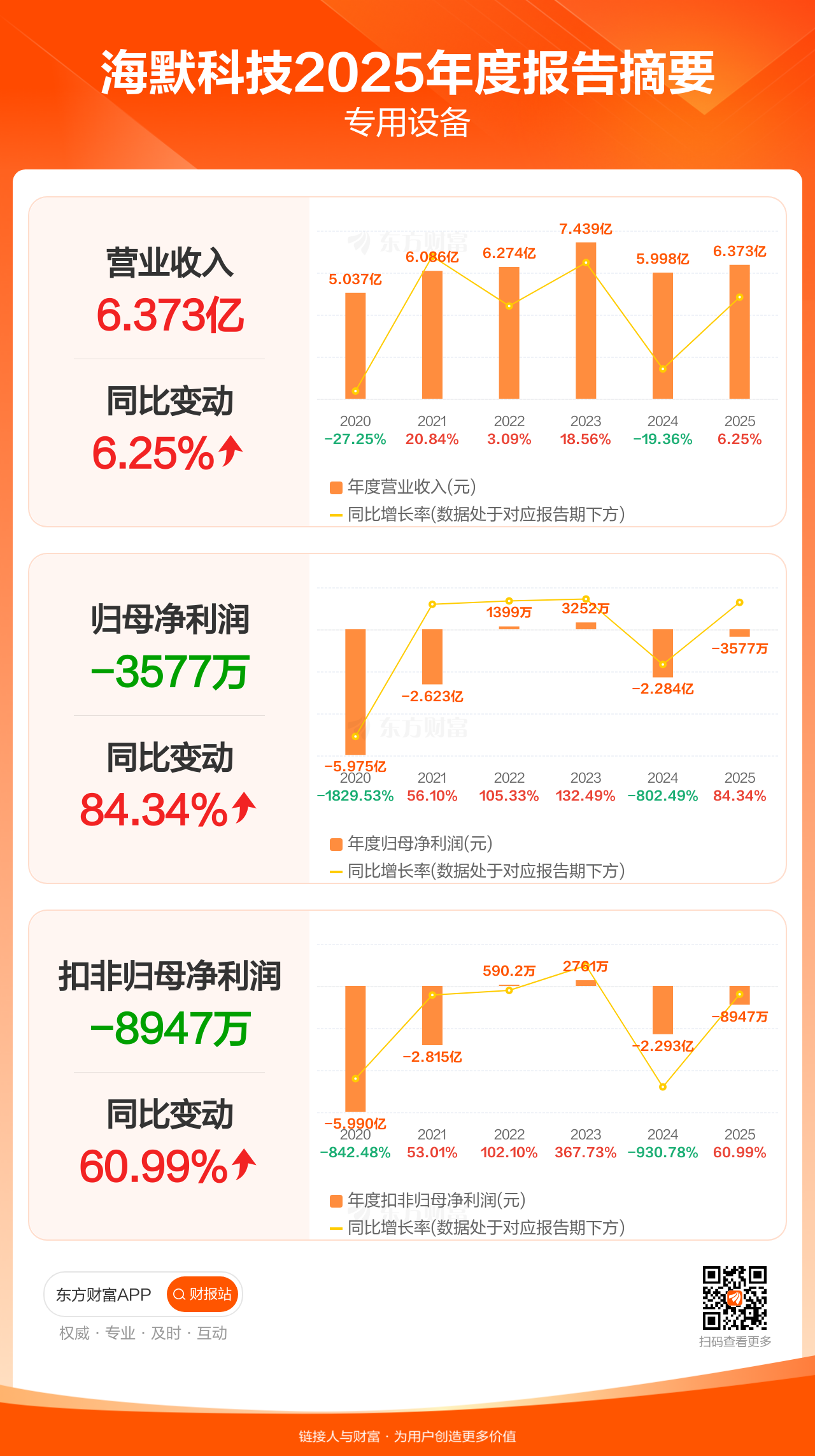 海默科技4月29日发布2025年年报显示,公司全年实现营业收入6.37亿元,同比增长6.25%;归母净利润-3576.67万元;扣非归母净利润-8946.60万元。