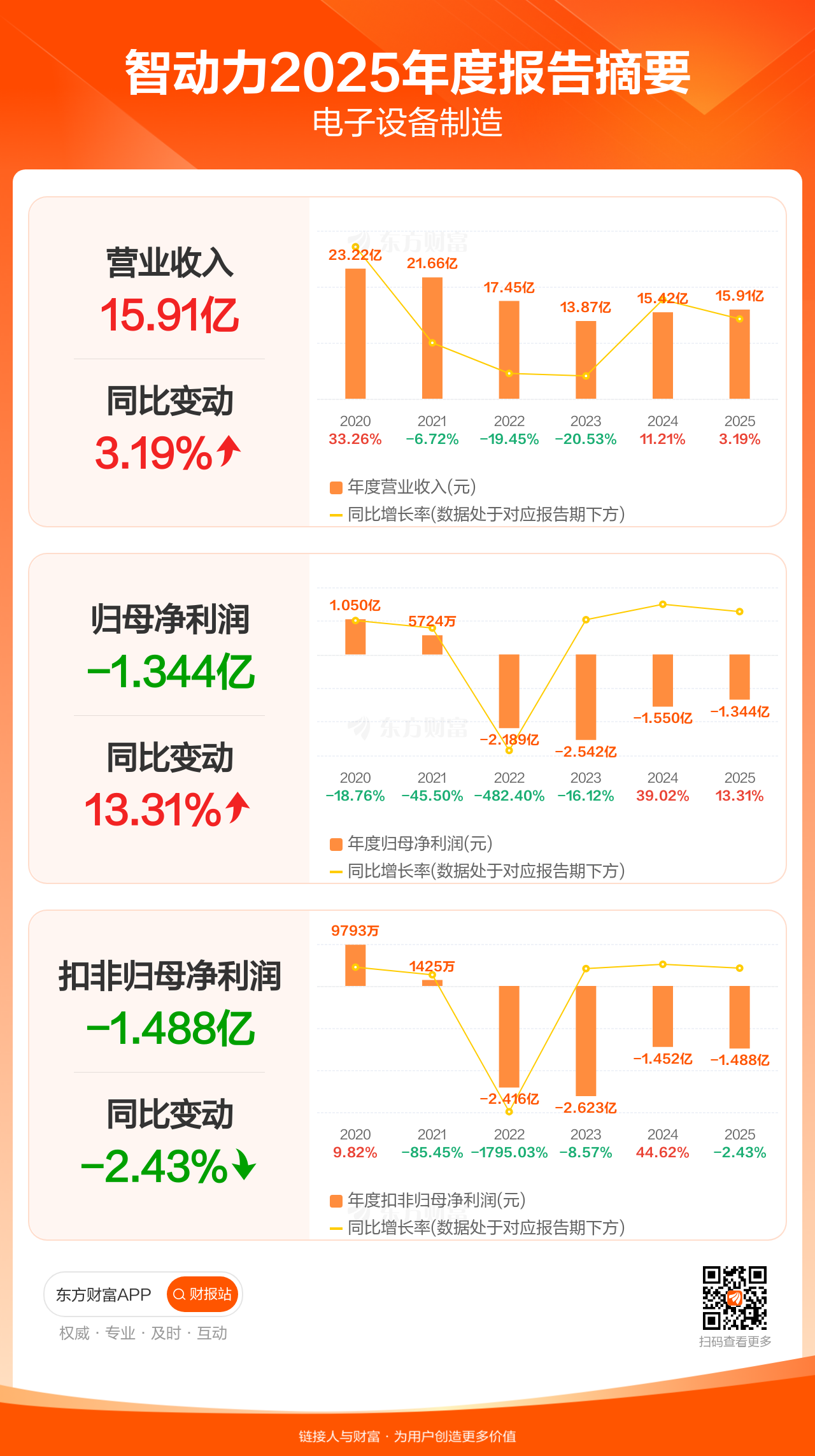 智动力4月29日发布2025年年报显示,公司全年实现营业收入15.91亿元,同比增长3.19%;归母净利润-1.34亿元;扣非归母净利润-1.49亿元。