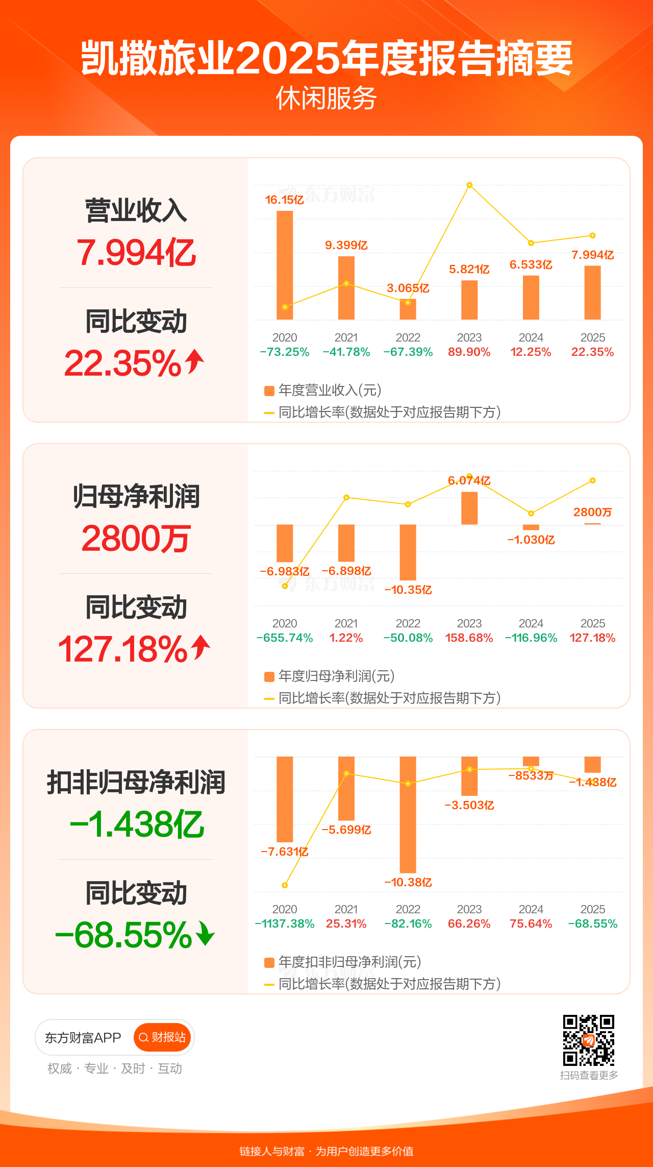 凯撒旅业4月29日发布2025年年报显示,公司全年实现营业收入7.99亿元,同比增长22.35%;归母净利润2800.13万元,同比增长127.18%;扣非归母净利润-1.44亿元。