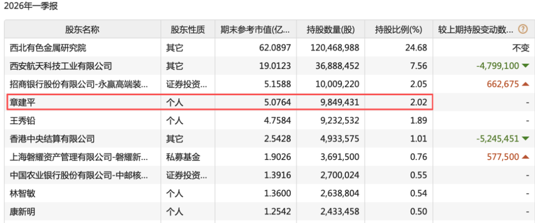 章建平新进成为西部材料的第四大股东,持有984.94万股,持股比例为2.02%。