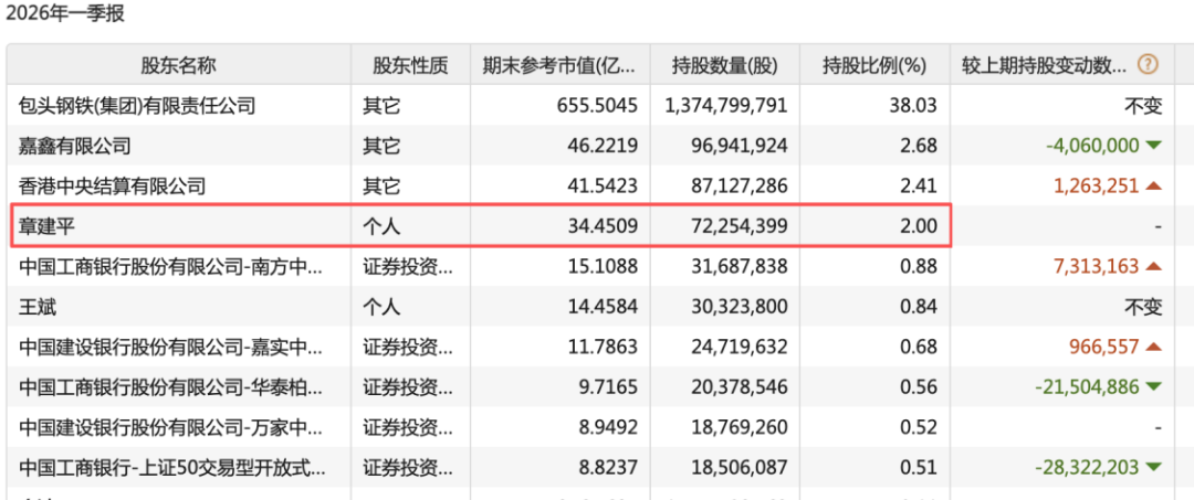 4月28日晚间,北方稀土发布2026年一季报。公司前十大股东名单中出现了章建平的名字:章建平持股7225.44万股,占总股本的2%,新进成为第四大股东。按一季度末股价计算,其持股市值高达34.45亿元。