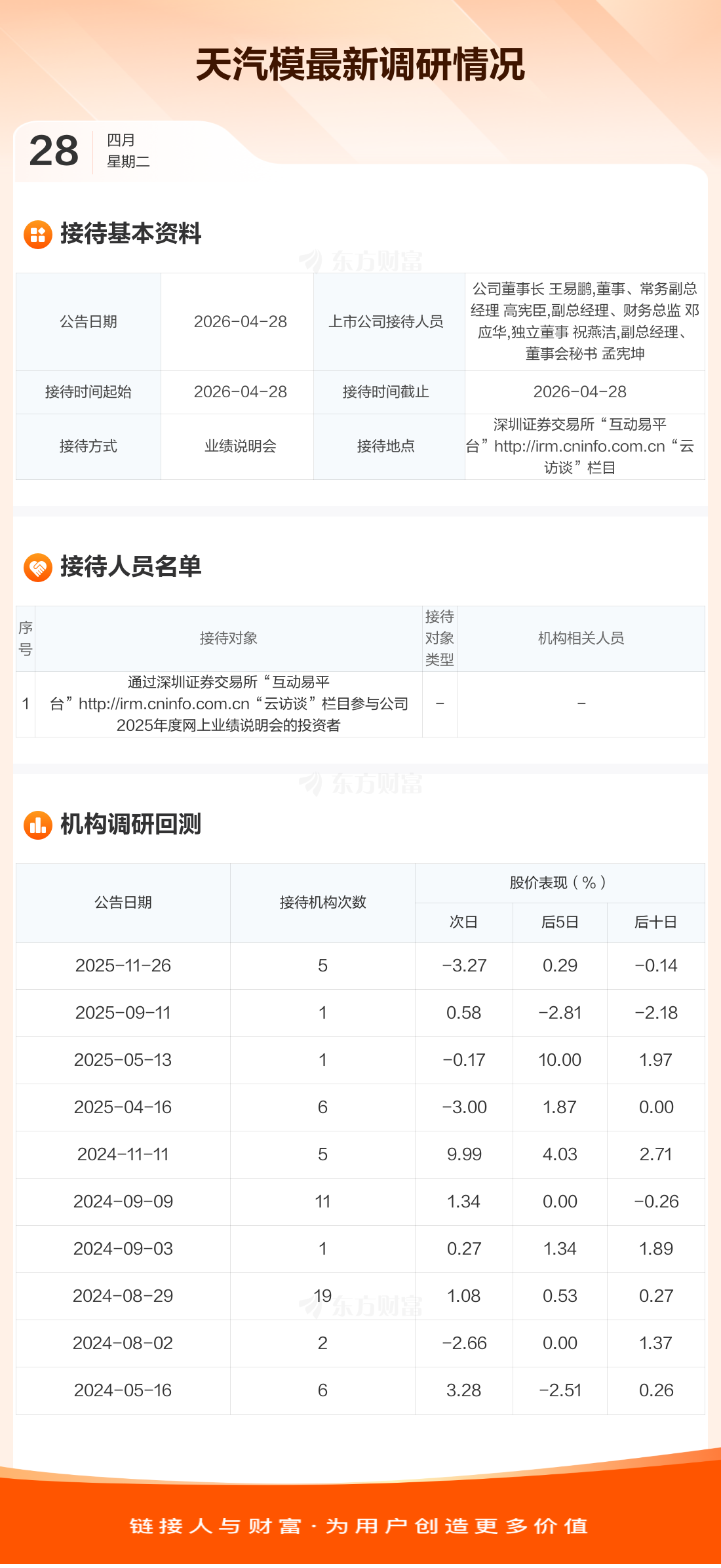 天汽模4月28日公告称,4月28日接待通过深圳证券交易所“互动易平台”http://irm.cninfo.com.cn“云访谈”栏目参与公司2025年度网上业绩说明会的投资者调研。接待人员包括公司董事长 王易鹏,董事、常务副总经理 高宪臣,副总经理、财务总监 邓应华,独立董事 祝燕洁,副总经理、董事会秘书 孟宪坤。