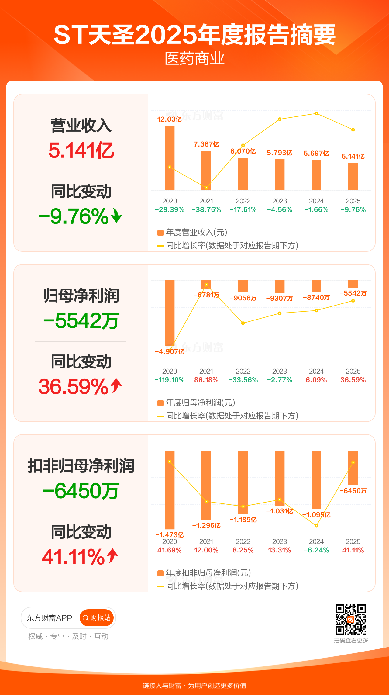 ST天圣4月29日发布2025年年报显示,公司全年实现营业收入5.14亿元,同比下滑9.76%;归母净利润-5542.35万元;扣非归母净利润-6450.33万元。