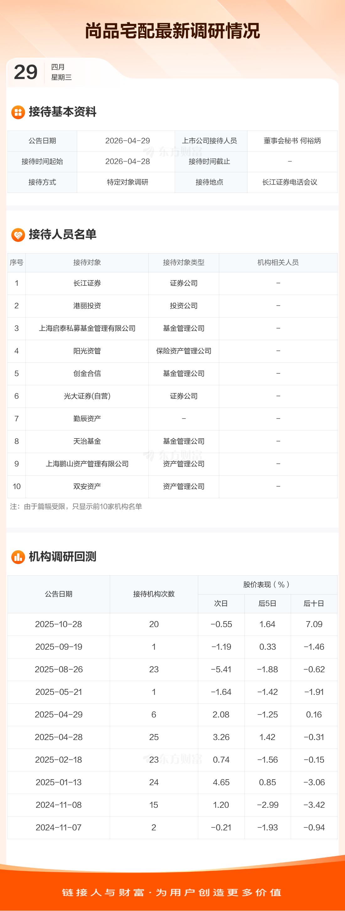 尚品宅配4月29日公告称,4月28日接待长江证券等29家机构调研。接待人员包括董事会秘书 何裕炳。