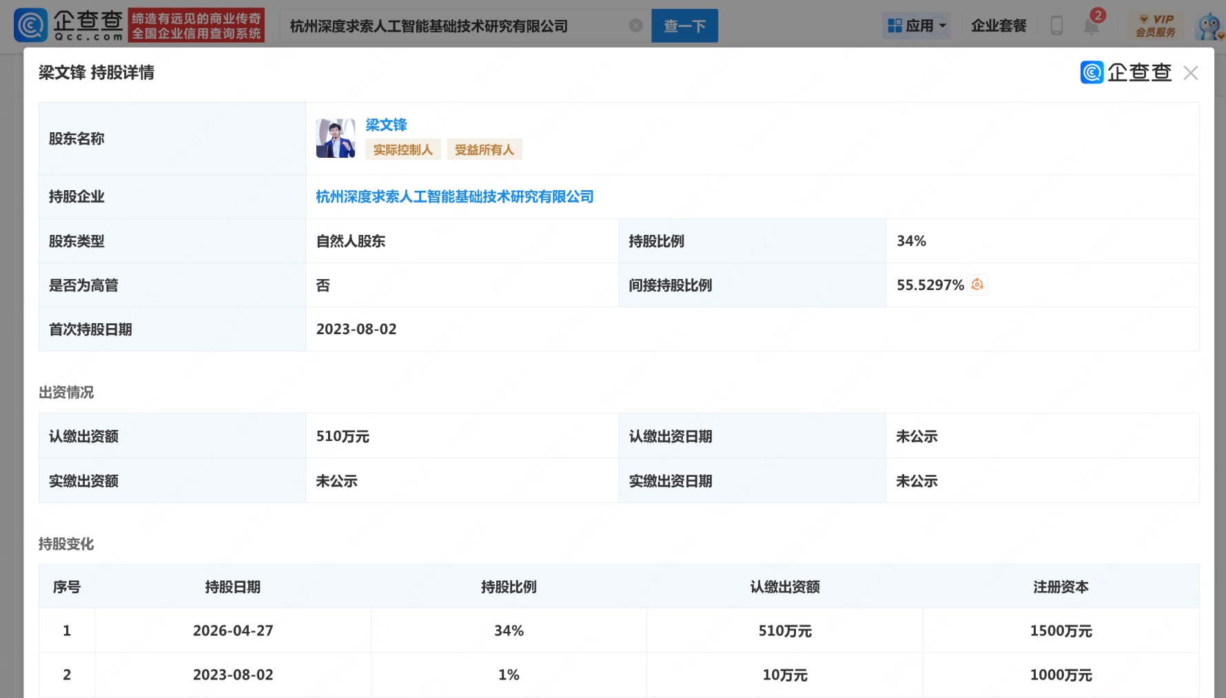 梁文锋增持DeepSeek 持股比例大幅上升
