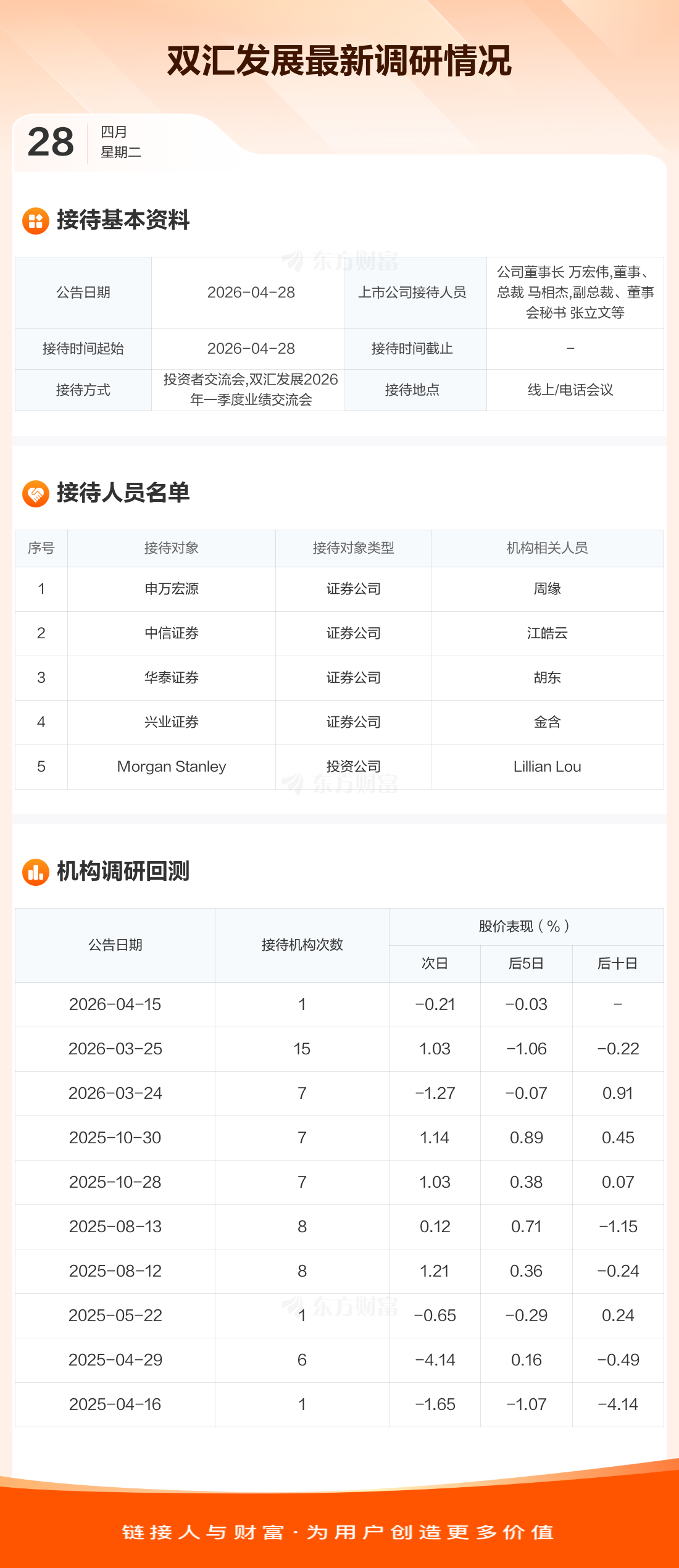 双汇发展4月28日公告称,4月28日接待申万宏源等5家机构调研。接待人员包括公司董事长 万宏伟,董事、总裁 马相杰,副总裁、董事会秘书 张立文等。