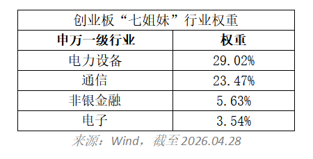 权重集中度极高。截至2026年4月28日,“七姐妹”合计占创业板50指数权重约61.66%,其中电力设备(新能源)行业权重29.02%,通信(AI算力/光模块)行业权重23.47%,两大行业合计超过52%。指数前五大成分股合计权重55.03%,前十大合计68.93%,龙头集中度显著高于创业板指。(数据来源:Wind)