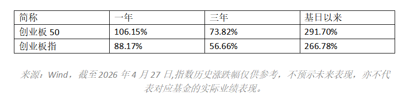 高集中度带来高弹性。截至2026年4月27日,创业板50指数近一年涨幅为106.15%,近三年涨幅73.82%,自基日(2010年5月31日)以来累计涨幅291.70%;同期创业板指分别为88.17%、56.66%和266.78%。