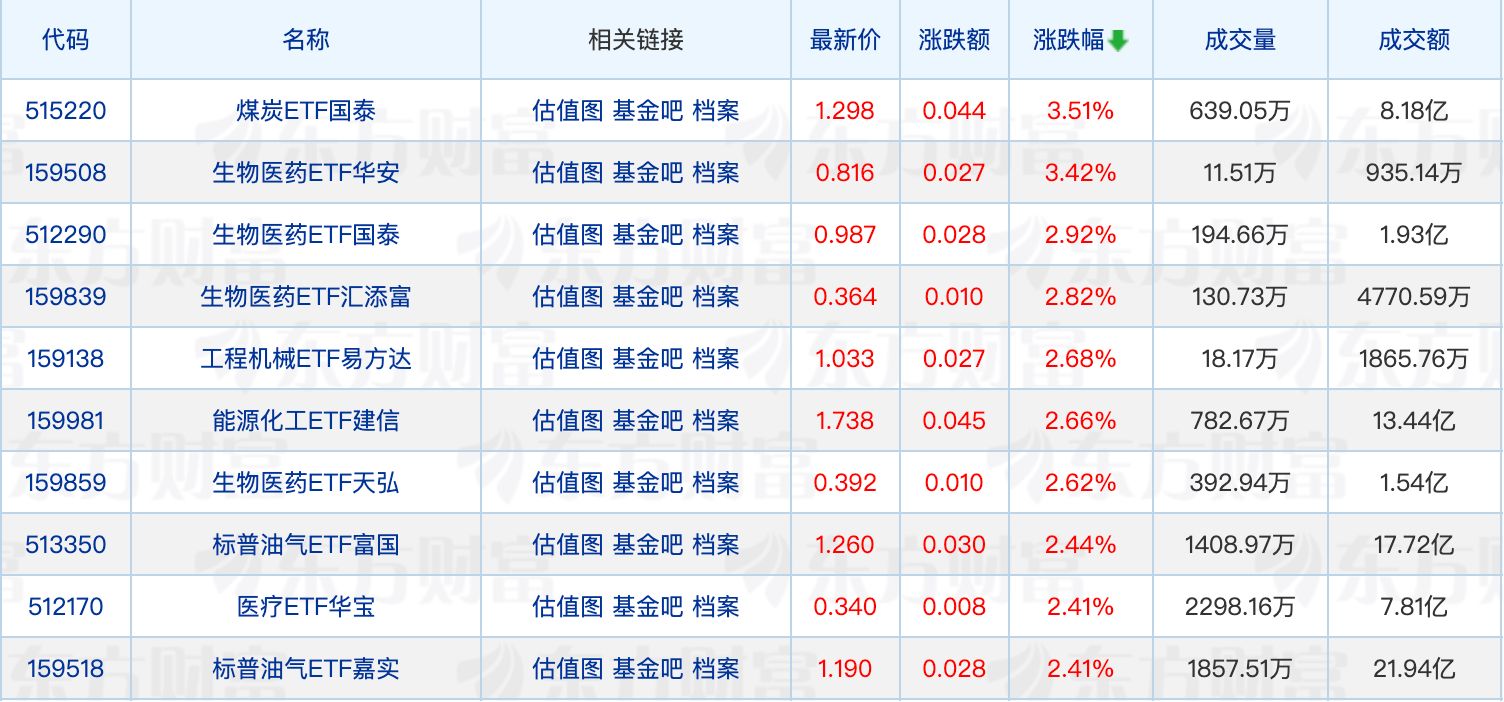 ETF涨跌幅方面,煤炭、生物医药相关ETF涨超3%。