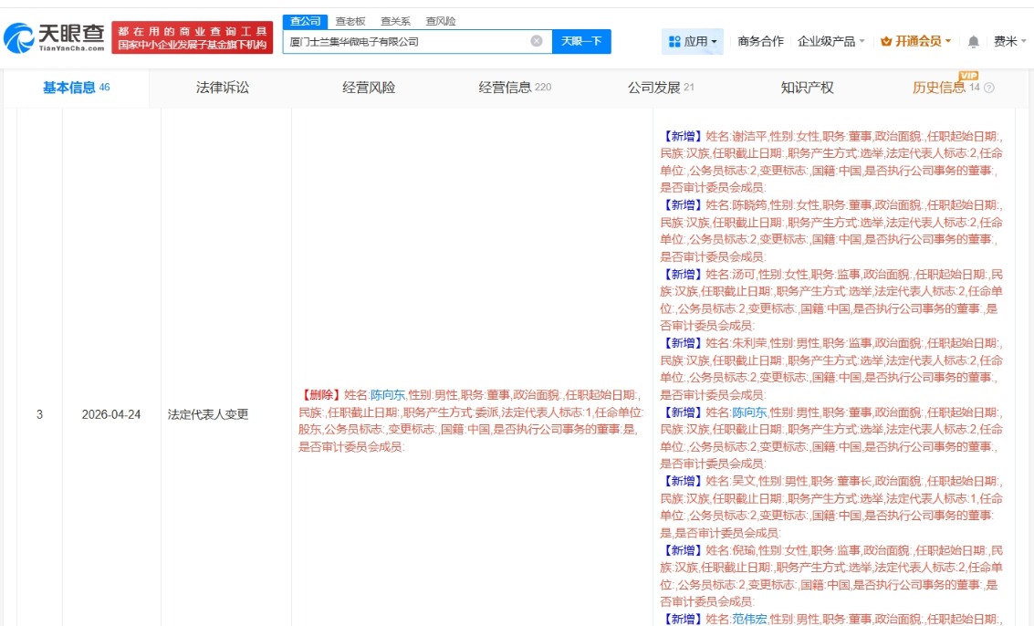 南方财经4月28日电,天眼查App显示,近日,厦门士兰集华微电子有限公司发生工商变更,新增厦门海厦联投投资合伙企业(有限合伙)、厦门产投鑫华科技投资合伙企业(有限合伙)等为股东,陈向东卸任法定代表人,由吴文接任,同时,注册资本由2.5亿人民币增至51.1亿人民币,增幅1944%。该公司成立于2025年6月,经营范围包括集成电路设计、集成电路芯片及产品制造、集成电路销售等,现由士兰微(600460)、厦门士兰微电子有限公司及上述新增股东共同持股。
