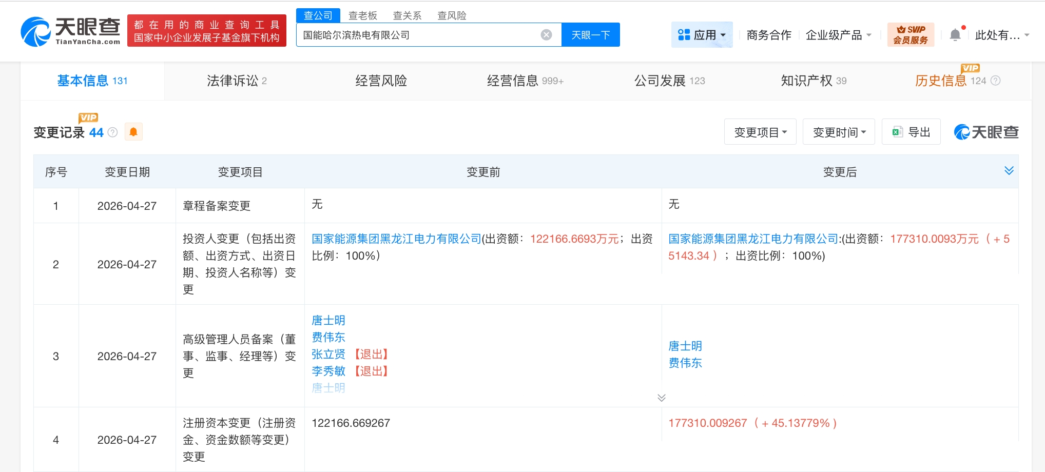 南方财经4月28日电,天眼查App显示,近日,国能哈尔滨热电有限公司发生工商变更,注册资本由约12.2亿人民币增至约17.7亿人民币,增幅约45%,同时,多位高管发生变更。该公司成立于2008年8月,法定代表人为费伟东,经营范围包括发电业务、输电业务、供(配)电业务、供电业务等,由国家能源集团黑龙江电力有限公司全资持股。