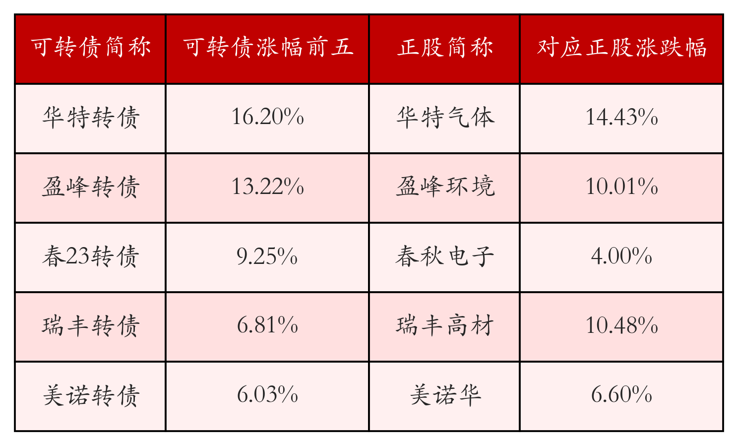 南财智讯4月28日电,盘后数据显示,债市方面,中证转债指数收跌0.7%,报512.19,成交额为759.56亿元。可转债方面,今日共成交333只可转债,其中69只收涨,0只收平,264只收跌。具体来看,11只可转债涨幅超过2%。其中华特转债(118033)涨16.2%,盈峰转债(127024)涨13.22%,春23转债(113667)涨9.25%。今日有64只可转债跌幅超2%,泰坦转债(127096)跌12.91%,富春转债(111005)跌12.86%,博瑞转债(118004)跌11.41%。存在交易量的可转债所对应的正股中,113只收涨,4只收平,216只收跌。具体来看,15只可转债对应正股涨幅超过5%,其中,盈峰环境(000967)涨停,收涨10.01%。同时所对应的可转债:盈峰转债(127024)同涨13.22%。今日有19只可转债对应正股跌幅超过5%,。同时所对应的可转债:芯能转债(113679)同跌4.42%。