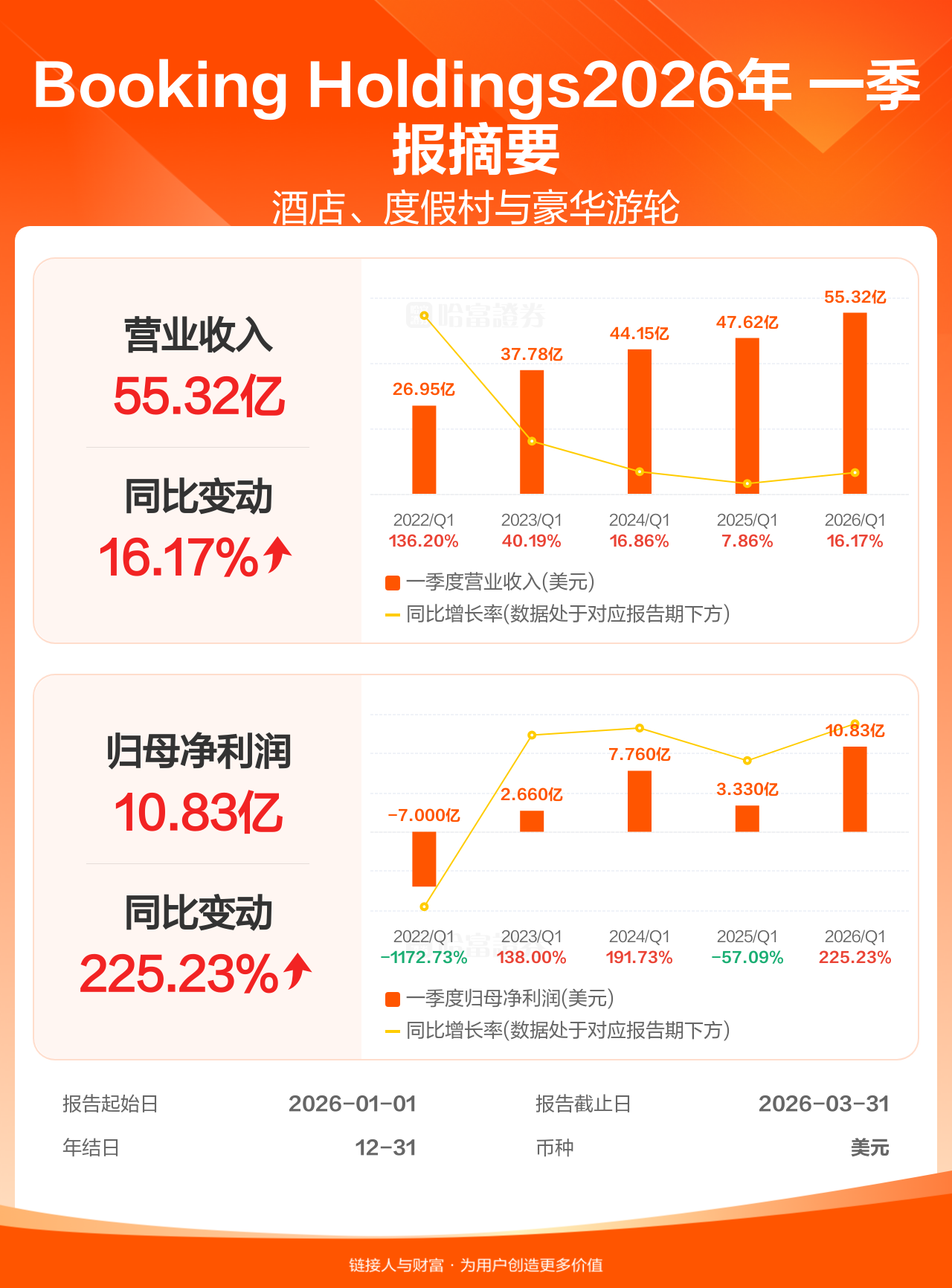 Booking Holdings4月28日发布一季报业绩,截至2026年3月31日的3个月内,该公司营业收入55.32亿美元,同比增长16.17%;公司权益持有人应占溢利(归母净利润)10.83亿美元,同比增长225.23%。
