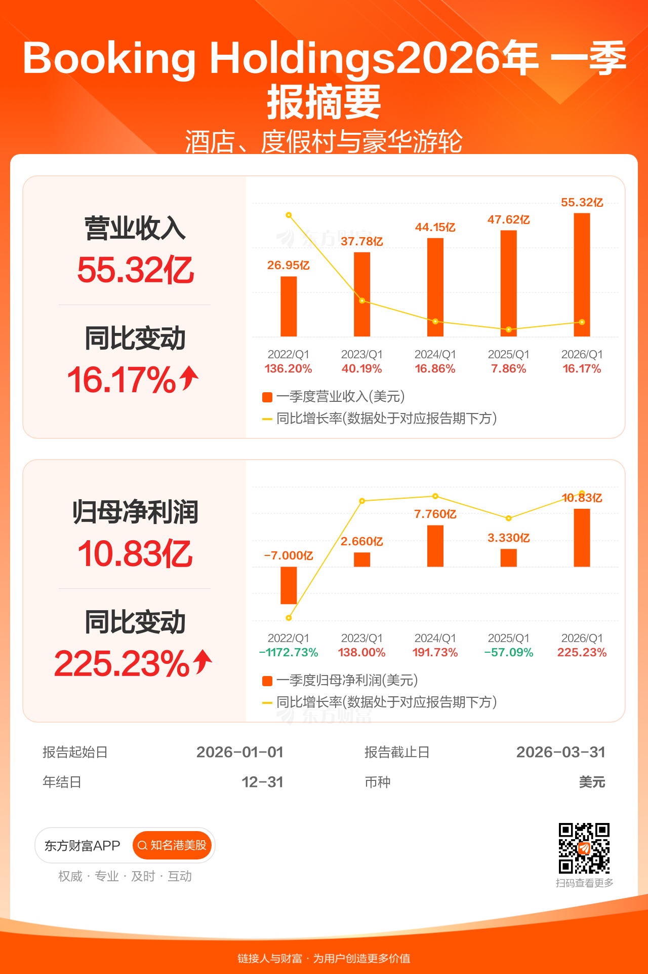 Booking Holdings4月28日发布一季报业绩,截至2026年3月31日的3个月内,该公司营业收入55.32亿美元,同比增长16.17%;公司权益持有人应占溢利(归母净利润)10.83亿美元,同比增长225.23%。