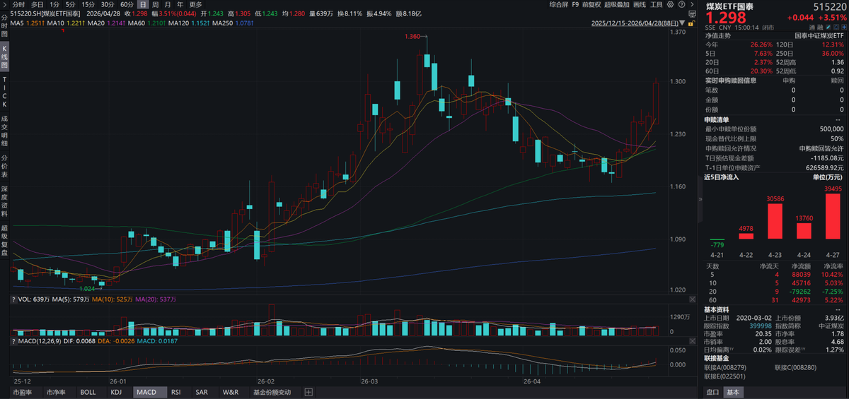煤炭板块六连阳是悲观情绪出清后基本面的集中重估。进口约束持续、火电与煤化工需求超预期、低库存与厄尔尼诺风险共振,旺季煤价具备超预期上行的条件。通过煤炭ETF(515220)分批布局,可在控制个股风险的同时捕捉行业景气抬升带来的中期投资机遇。