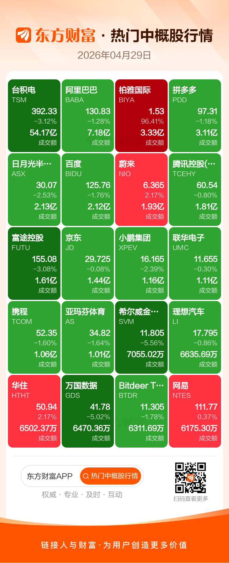 台积电跌3.12%,阿里巴巴跌1.28%,柏雅国际涨96.41%,拼多多跌1.18%,日月光半导体跌2.53%,百度跌1.76%,蔚来涨2.17%,腾讯控股(ADR)跌0.80%,富途控股跌3.08%,京东跌0.08%。