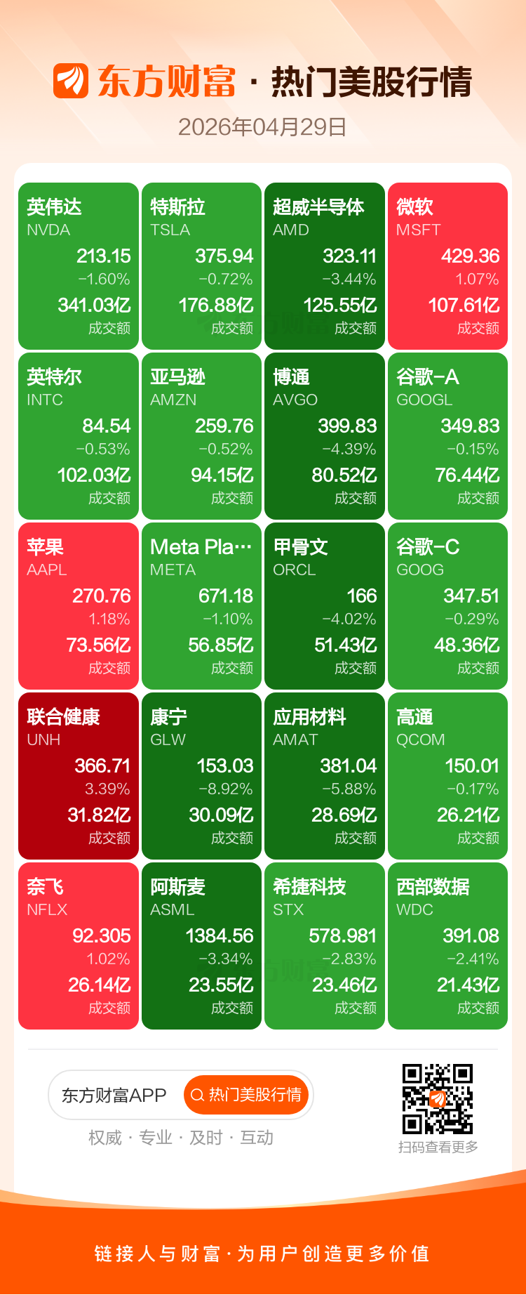 英伟达跌1.60%,特斯拉跌0.72%,超威半导体跌3.44%,微软涨1.07%,英特尔跌0.53%,亚马逊跌0.52%,博通跌4.39%,谷歌-A跌0.15%,苹果涨1.18%,Meta Platforms Inc-A跌1.10%。