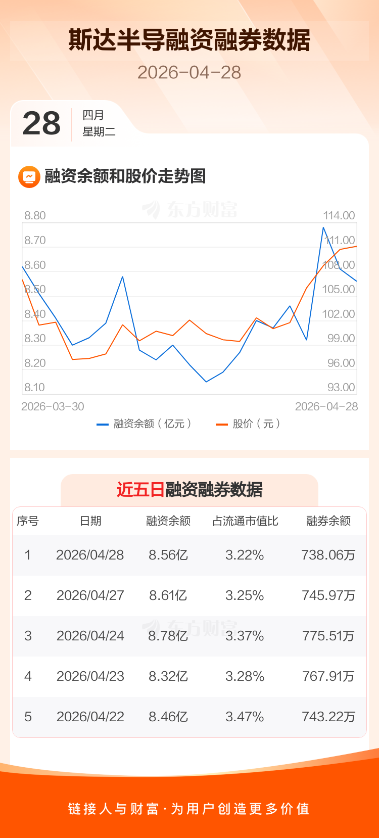 交易所最新数据显示,斯达半导于2026年4月28日获融资买入1.10亿元,融资偿还1.16亿元,当日融资净偿还546.37万元。目前,该股融资余额8.56亿,占流通市值比例为3.22%。