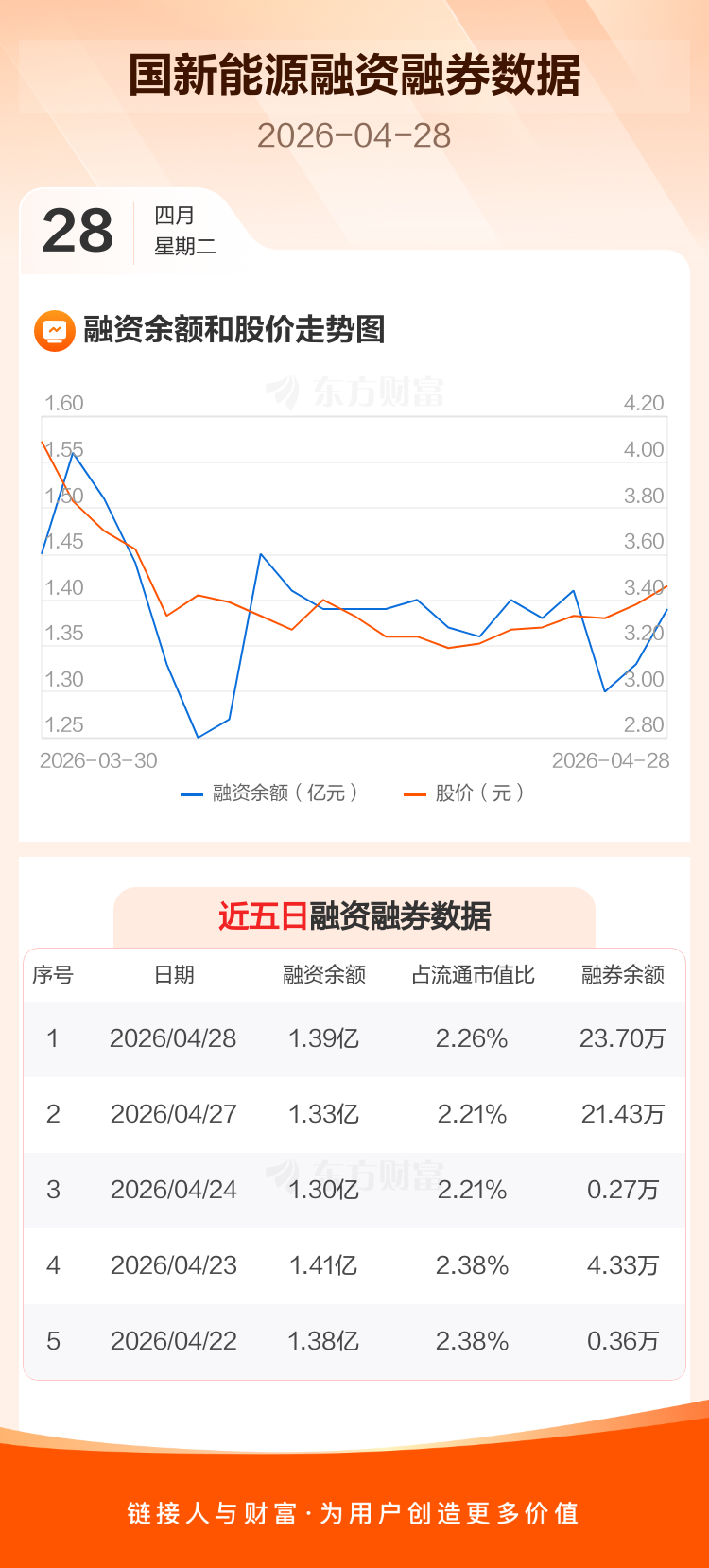 交易所最新数据显示,国新能源于2026年4月28日获融资买入1542.03万元,融资偿还942.23万元,当日融资净买入599.8万元。目前,该股融资余额1.39亿,占流通市值比例为2.26%。
