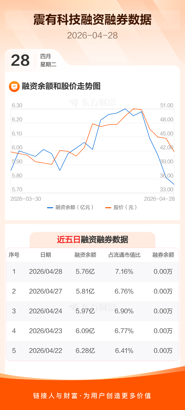 交易所最新数据显示,震有科技于2026年4月28日获融资买入3260.98万元,融资偿还3789.00万元,当日融资净偿还528.02万元。目前,该股融资余额5.76亿,占流通市值比例为7.16%。