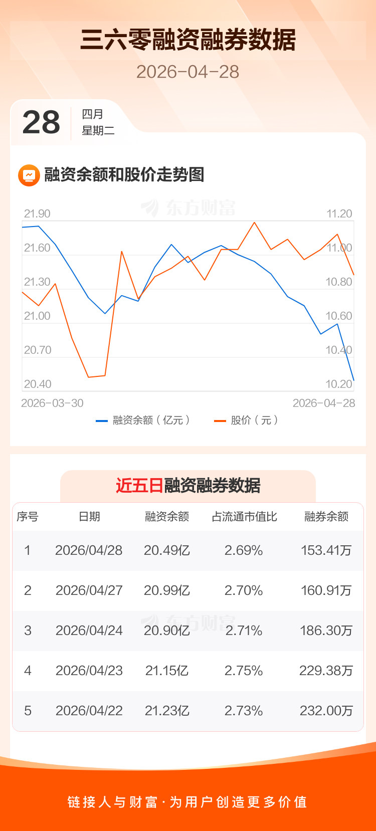 交易所最新数据显示,三六零于2026年4月28日获融资买入5855.89万元,融资偿还1.08亿元,当日融资净偿还4949.94万元。目前,该股融资余额20.49亿,占流通市值比例为2.69%。