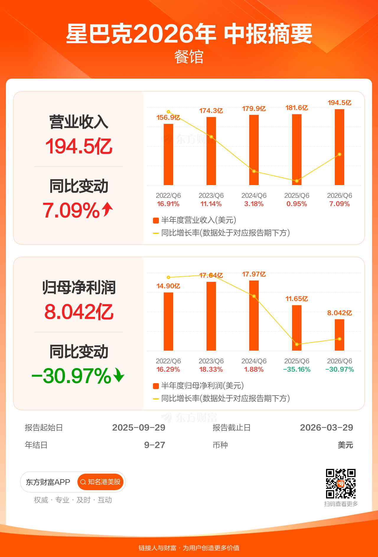 星巴克4月28日发布中期业绩,截至2026年3月29日的6个月内,该公司营业收入194.47亿美元,同比增长7.09%;公司权益持有人应占溢利(归母净利润)8.04亿美元,同比减少30.97%。