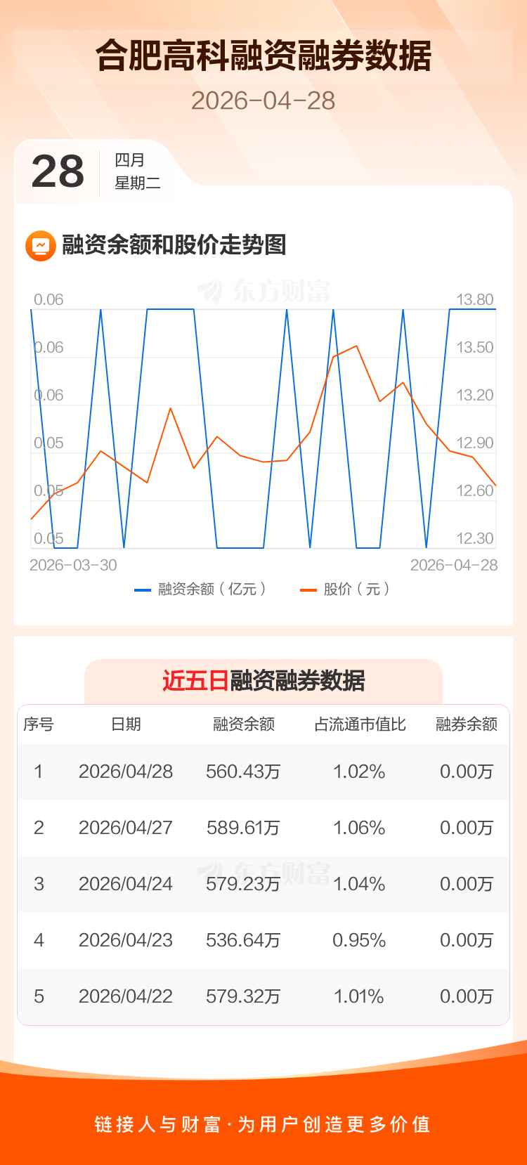 交易所最新数据显示,合肥高科于2026年4月28日获融资买入70.28万元,融资偿还99.46万元,当日融资净偿还29.17万元。目前,该股融资余额560.43万,占流通市值比例为1.02%。