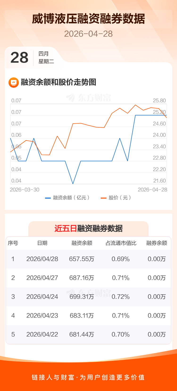 交易所最新数据显示,威博液压于2026年4月28日获融资买入19.03万元,融资偿还48.64万元,当日融资净偿还29.6万元。目前,该股融资余额657.55万,占流通市值比例为0.69%。