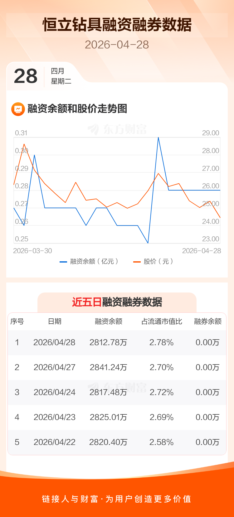 交易所最新数据显示,恒立钻具于2026年4月28日获融资买入35.86万元,融资偿还64.32万元,当日融资净偿还28.46万元。目前,该股融资余额2812.78万,占流通市值比例为2.78%。