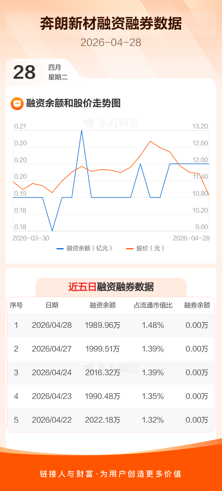 交易所最新数据显示,奔朗新材于2026年4月28日获融资买入188.73万元,融资偿还198.29万元,当日融资净偿还9.56万元。目前,该股融资余额1989.96万,占流通市值比例为1.48%。