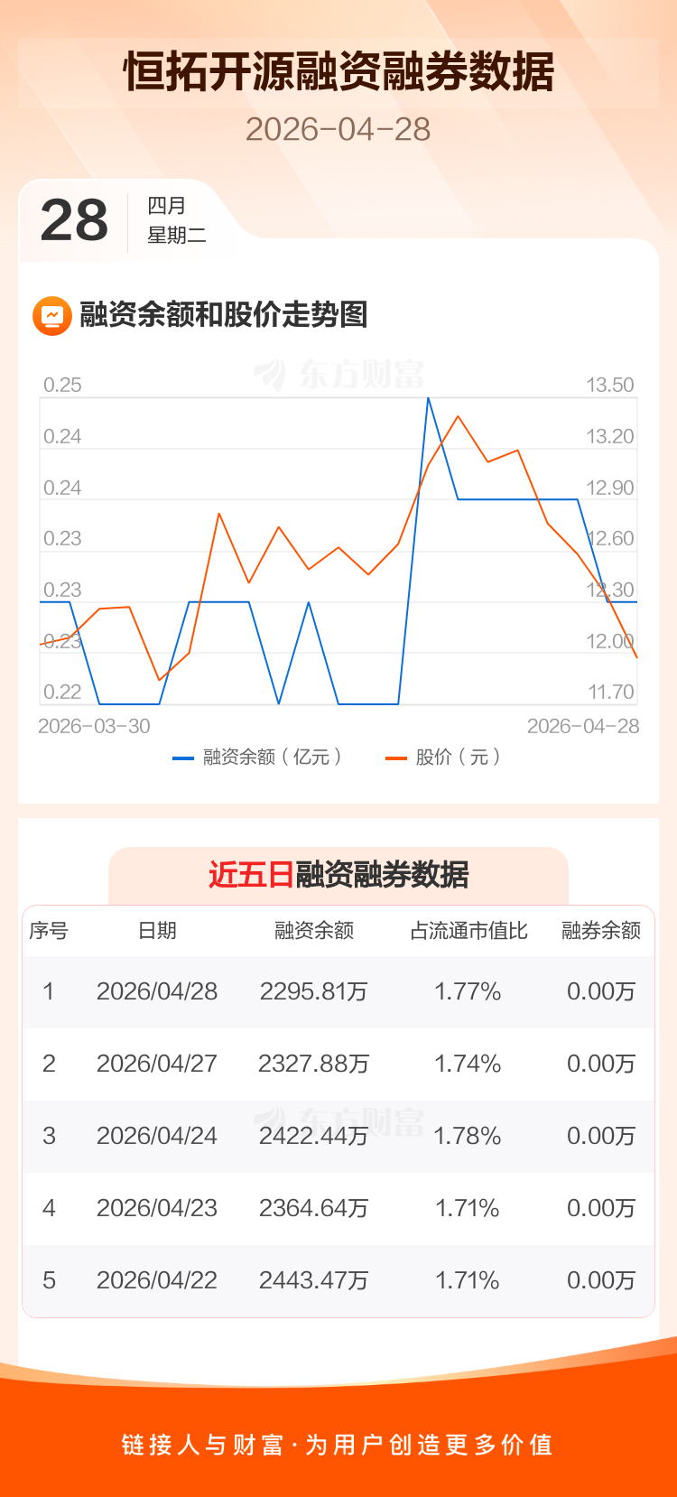 交易所最新数据显示,恒拓开源于2026年4月28日获融资买入90.61万元,融资偿还122.69万元,当日融资净偿还32.07万元。目前,该股融资余额2295.81万,占流通市值比例为1.77%。